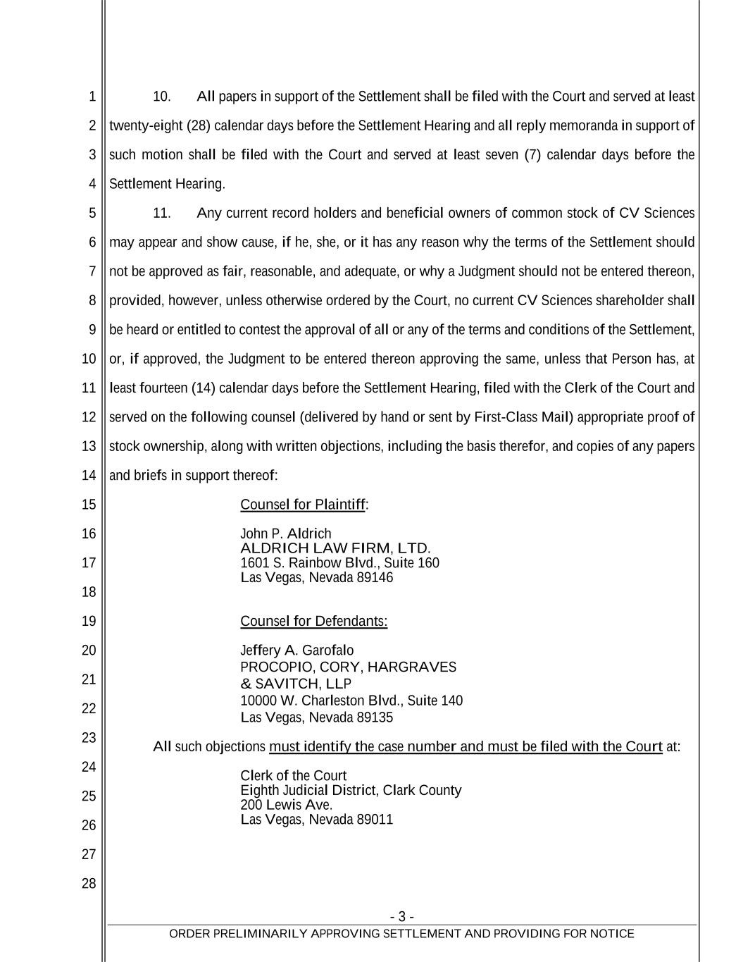 - 3 - ORDER PRELIMINARILY APPROVING SETTLEMENT AND PROVIDING FOR NOTICE 1 2 3 4 5 6 7 8 9 10 11 12 13 14 15 16 17 18 19 20 21 22 23 24 25 26 27 28 10. All papers in support of the Settlement shall be filed with the Court and served at least twenty-eight (28) calendar days before the Settlement Hearing and all reply memoranda in support of such motion shall be filed with the Court and served at least seven (7) calendar days before the Settlement Hearing. 11. Any current record holders and beneficial owners of common stock of CV Sciences may appear and show cause, if he, she, or it has any reason why the terms of the Settlement should not be approved as fair, reasonable, and adequate, or why a Judgment should not be entered thereon, provided, however, unless otherwise ordered by the Court, no current CV Sciences shareholder shall be heard or entitled to contest the approval of all or any of the terms and conditions of the Settlement, or, if approved, the Judgment to be entered thereon approving the same, unless that Person has, at least fourteen (14) calendar days before the Settlement Hearing, filed with the Clerk of the Court and served on the following counsel (delivered by hand or sent by First-Class Mail) appropriate proof of stock ownership, along with written objections, including the basis therefor, and copies of any papers and briefs in support thereof: Counsel for Plaintiff: John P. Aldrich ALDRICH LAW FIRM, LTD. 1601 S. Rainbow Blvd., Suite 160 Las Vegas, Nevada 89146 Counsel for Defendants: Jeffery A. Garofalo PROCOPIO, CORY, HARGRAVES & SAVITCH, LLP 10000 W. Charleston Blvd., Suite 140 Las Vegas, Nevada 89135 All such objections must identify the case number and must be filed with the Court at: Clerk of the Court Eighth Judicial District, Clark County 200 Lewis Ave. Las Vegas, Nevada 89011