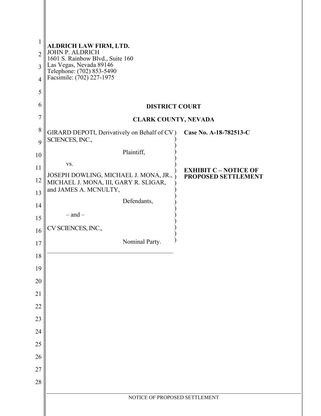 NOTICE OF PROPOSED SETTLEMENT 1 2 3 4 5 6 7 8 9 10 11 12 13 14 15 16 17 18 19 20 21 22 23 24 25 26 27 28 ALDRICH LAW FIRM, LTD. JOHN P. ALDRICH 1601 S. Rainbow Blvd., Suite 160 Las Vegas, Nevada 89146 Telephone: (702) 853-5490 Facsimile: (702) 227-1975 DISTRICT COURT CLARK COUNTY, NEVADA GIRARD DEPOTI, Derivatively on Behalf of CV SCIENCES, INC., Plaintiff, vs. JOSEPH DOWLING, MICHAEL J. MONA, JR., MICHAEL J. MONA, III, GARY R. SLIGAR, and JAMES A. MCNULTY, Defendants, – and – CV SCIENCES, INC., Nominal Party. ) ) ) ) ) ) ) ) ) ) ) ) ) ) ) ) ) ) Case No. A-18-782513-C EXHIBIT C – NOTICE OF PROPOSED SETTLEMENT