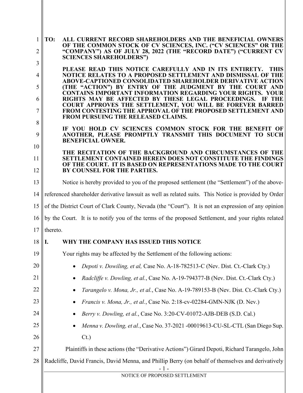 - 1 - NOTICE OF PROPOSED SETTLEMENT 1 2 3 4 5 6 7 8 9 10 11 12 13 14 15 16 17 18 19 20 21 22 23 24 25 26 27 28 TO: ALL CURRENT RECORD SHAREHOLDERS AND THE BENEFICIAL OWNERS OF THE COMMON STOCK OF CV SCIENCES, INC. (“CV SCIENCES” OR THE “COMPANY”) AS OF JULY 28, 2022 (THE “RECORD DATE”) (“CURRENT CV SCIENCES SHAREHOLDERS”) PLEASE READ THIS NOTICE CAREFULLY AND IN ITS ENTIRETY. THIS NOTICE RELATES TO A PROPOSED SETTLEMENT AND DISMISSAL OF THE ABOVE-CAPTIONED CONSOLIDATED SHAREHOLDER DERIVATIVE ACTION (THE “ACTION”) BY ENTRY OF THE JUDGMENT BY THE COURT AND CONTAINS IMPORTANT INFORMATION REGARDING YOUR RIGHTS. YOUR RIGHTS MAY BE AFFECTED BY THESE LEGAL PROCEEDINGS. IF THE COURT APPROVES THE SETTLEMENT, YOU WILL BE FOREVER BARRED FROM CONTESTING THE APPROVAL OF THE PROPOSED SETTLEMENT AND FROM PURSUING THE RELEASED CLAIMS. IF YOU HOLD CV SCIENCES COMMON STOCK FOR THE BENEFIT OF ANOTHER, PLEASE PROMPTLY TRANSMIT THIS DOCUMENT TO SUCH BENEFICIAL OWNER. THE RECITATION OF THE BACKGROUND AND CIRCUMSTANCES OF THE SETTLEMENT CONTAINED HEREIN DOES NOT CONSTITUTE THE FINDINGS OF THE COURT. IT IS BASED ON REPRESENTATIONS MADE TO THE COURT BY COUNSEL FOR THE PARTIES. Notice is hereby provided to you of the proposed settlement (the “Settlement”) of the above- referenced shareholder derivative lawsuit as well as related suits. This Notice is provided by Order of the District Court of Clark County, Nevada (the “Court”). It is not an expression of any opinion by the Court. It is to notify you of the terms of the proposed Settlement, and your rights related thereto. I. WHY THE COMPANY HAS ISSUED THIS NOTICE Your rights may be affected by the Settlement of the following actions: • Depoti v. Dowiling, et al, Case No. A-18-782513-C (Nev. Dist. Ct.-Clark Cty.) • Radcliffe v. Dowling, et al., Case No. A-19-794377-B (Nev. Dist. Ct.-Clark Cty.) • Tarangelo v. Mona, Jr., et al., Case No. A-19-789153-B (Nev. Dist. Ct.-Clark Cty.) • Francis v. Mona, Jr., et al., Case No. 2:18-cv-02284-GMN-NJK (D. Nev.) • Berry v. Dowling, et al., Case No. 3:20-CV-01072-AJB-DEB (S.D. Cal.) • Menna v. Dowling, et al., Case No. 37-2021 -00019613-CU-SL-CTL (San Diego Sup. Ct.) Plaintiffs in these actions (the “Derivative Actions”) Girard Depoti, Richard Tarangelo, John Radcliffe, David Francis, David Menna, and Phillip Berry (on behalf of themselves and derivatively