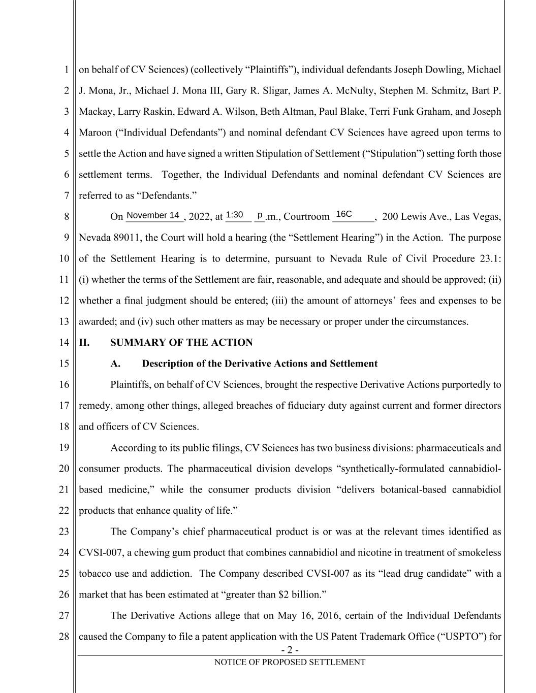 - 2 - NOTICE OF PROPOSED SETTLEMENT 1 2 3 4 5 6 7 8 9 10 11 12 13 14 15 16 17 18 19 20 21 22 23 24 25 26 27 28 on behalf of CV Sciences) (collectively “Plaintiffs”), individual defendants Joseph Dowling, Michael J. Mona, Jr., Michael J. Mona III, Gary R. Sligar, James A. McNulty, Stephen M. Schmitz, Bart P. Mackay, Larry Raskin, Edward A. Wilson, Beth Altman, Paul Blake, Terri Funk Graham, and Joseph Maroon (“Individual Defendants”) and nominal defendant CV Sciences have agreed upon terms to settle the Action and have signed a written Stipulation of Settlement (“Stipulation”) setting forth those settlement terms. Together, the Individual Defendants and nominal defendant CV Sciences are referred to as “Defendants.” On ___________, 2022, at _____ __.m., Courtroom ________, 200 Lewis Ave., Las Vegas, Nevada 89011, the Court will hold a hearing (the “Settlement Hearing”) in the Action. The purpose of the Settlement Hearing is to determine, pursuant to Nevada Rule of Civil Procedure 23.1: (i) whether the terms of the Settlement are fair, reasonable, and adequate and should be approved; (ii) whether a final judgment should be entered; (iii) the amount of attorneys’ fees and expenses to be awarded; and (iv) such other matters as may be necessary or proper under the circumstances. II. SUMMARY OF THE ACTION A. Description of the Derivative Actions and Settlement Plaintiffs, on behalf of CV Sciences, brought the respective Derivative Actions purportedly to remedy, among other things, alleged breaches of fiduciary duty against current and former directors and officers of CV Sciences. According to its public filings, CV Sciences has two business divisions: pharmaceuticals and consumer products. The pharmaceutical division develops “synthetically-formulated cannabidiol- based medicine,” while the consumer products division “delivers botanical-based cannabidiol products that enhance quality of life.” The Company’s chief pharmaceutical product is or was at the relevant times identified as CVSI-007, a chewing gum product that combines cannabidiol and nicotine in treatment of smokeless tobacco use and addiction. The Company described CVSI-007 as its “lead drug candidate” with a market that has been estimated at “greater than $2 billion.” The Derivative Actions allege that on May 16, 2016, certain of the Individual Defendants caused the Company to file a patent application with the US Patent Trademark Office (“USPTO”) for