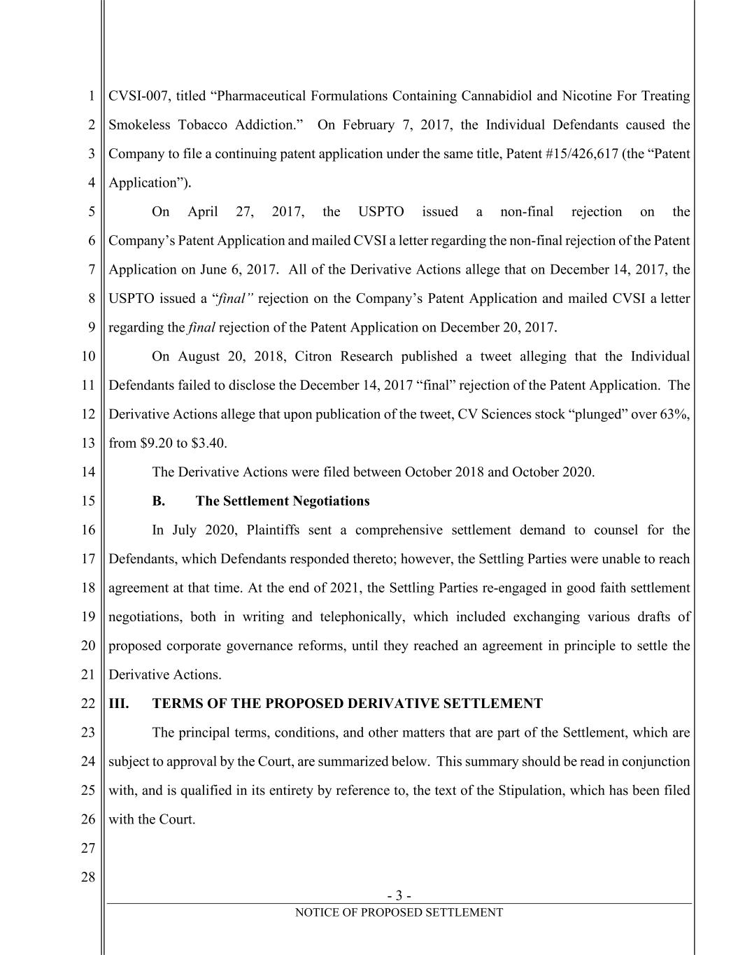 - 3 - NOTICE OF PROPOSED SETTLEMENT 1 2 3 4 5 6 7 8 9 10 11 12 13 14 15 16 17 18 19 20 21 22 23 24 25 26 27 28 CVSI-007, titled “Pharmaceutical Formulations Containing Cannabidiol and Nicotine For Treating Smokeless Tobacco Addiction.” On February 7, 2017, the Individual Defendants caused the Company to file a continuing patent application under the same title, Patent #15/426,617 (the “Patent Application”). On April 27, 2017, the USPTO issued a non-final rejection on the Company’s Patent Application and mailed CVSI a letter regarding the non-final rejection of the Patent Application on June 6, 2017. All of the Derivative Actions allege that on December 14, 2017, the USPTO issued a “final” rejection on the Company’s Patent Application and mailed CVSI a letter regarding the final rejection of the Patent Application on December 20, 2017. On August 20, 2018, Citron Research published a tweet alleging that the Individual Defendants failed to disclose the December 14, 2017 “final” rejection of the Patent Application. The Derivative Actions allege that upon publication of the tweet, CV Sciences stock “plunged” over 63%, from $9.20 to $3.40. The Derivative Actions were filed between October 2018 and October 2020. B. The Settlement Negotiations In July 2020, Plaintiffs sent a comprehensive settlement demand to counsel for the Defendants, which Defendants responded thereto; however, the Settling Parties were unable to reach agreement at that time. At the end of 2021, the Settling Parties re-engaged in good faith settlement negotiations, both in writing and telephonically, which included exchanging various drafts of proposed corporate governance reforms, until they reached an agreement in principle to settle the Derivative Actions. III. TERMS OF THE PROPOSED DERIVATIVE SETTLEMENT The principal terms, conditions, and other matters that are part of the Settlement, which are subject to approval by the Court, are summarized below. This summary should be read in conjunction with, and is qualified in its entirety by reference to, the text of the Stipulation, which has been filed with the Court.