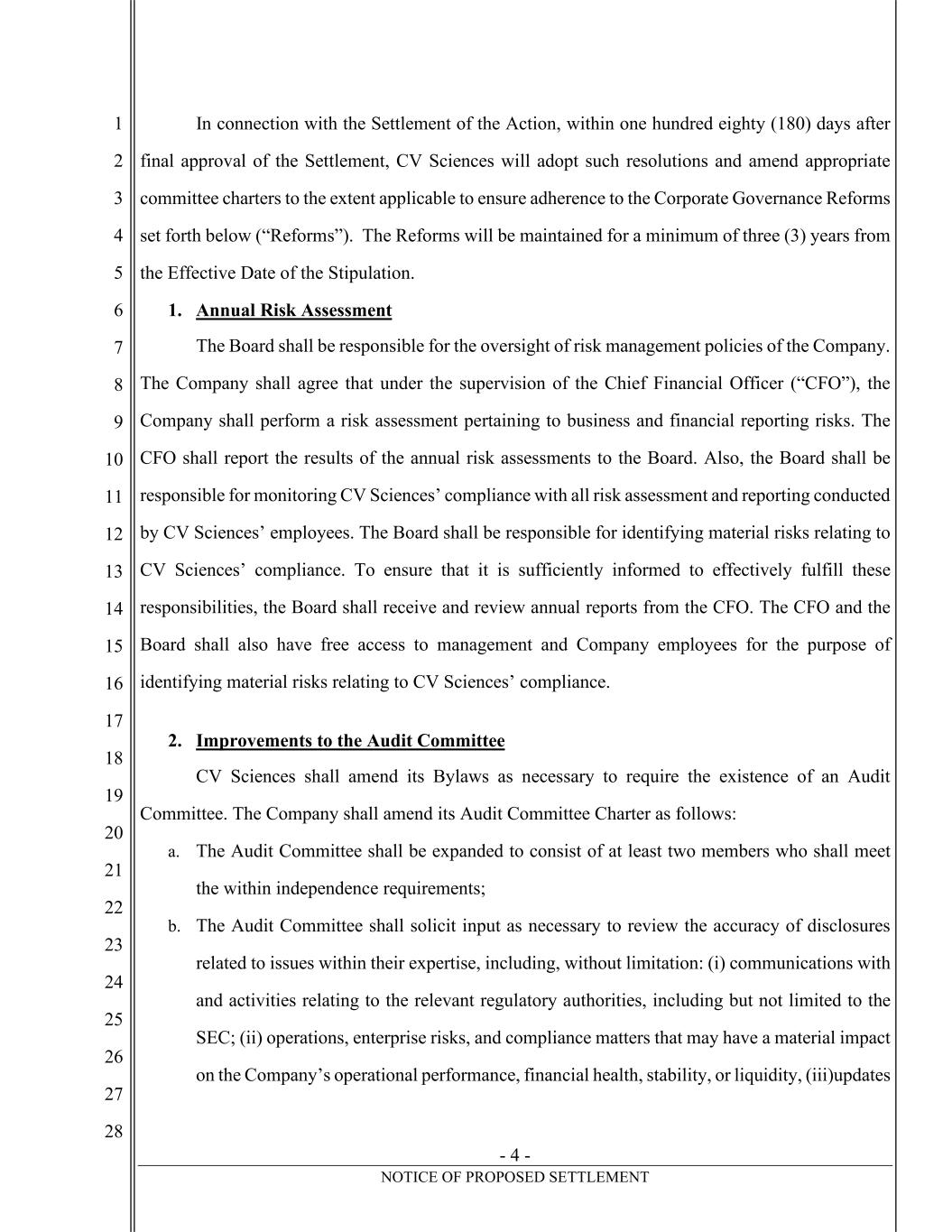 - 4 - NOTICE OF PROPOSED SETTLEMENT 1 2 3 4 5 6 7 8 9 10 11 12 13 14 15 16 17 18 19 20 21 22 23 24 25 26 27 28 In connection with the Settlement of the Action, within one hundred eighty (180) days after final approval of the Settlement, CV Sciences will adopt such resolutions and amend appropriate committee charters to the extent applicable to ensure adherence to the Corporate Governance Reforms set forth below (“Reforms”). The Reforms will be maintained for a minimum of three (3) years from the Effective Date of the Stipulation. 1. Annual Risk Assessment The Board shall be responsible for the oversight of risk management policies of the Company. The Company shall agree that under the supervision of the Chief Financial Officer (“CFO”), the Company shall perform a risk assessment pertaining to business and financial reporting risks. The CFO shall report the results of the annual risk assessments to the Board. Also, the Board shall be responsible for monitoring CV Sciences’ compliance with all risk assessment and reporting conducted by CV Sciences’ employees. The Board shall be responsible for identifying material risks relating to CV Sciences’ compliance. To ensure that it is sufficiently informed to effectively fulfill these responsibilities, the Board shall receive and review annual reports from the CFO. The CFO and the Board shall also have free access to management and Company employees for the purpose of identifying material risks relating to CV Sciences’ compliance. 2. Improvements to the Audit Committee CV Sciences shall amend its Bylaws as necessary to require the existence of an Audit Committee. The Company shall amend its Audit Committee Charter as follows: a. The Audit Committee shall be expanded to consist of at least two members who shall meet the within independence requirements; b. The Audit Committee shall solicit input as necessary to review the accuracy of disclosures related to issues within their expertise, including, without limitation: (i) communications with and activities relating to the relevant regulatory authorities, including but not limited to the SEC; (ii) operations, enterprise risks, and compliance matters that may have a material impact on the Company’s operational performance, financial health, stability, or liquidity, (iii)updates