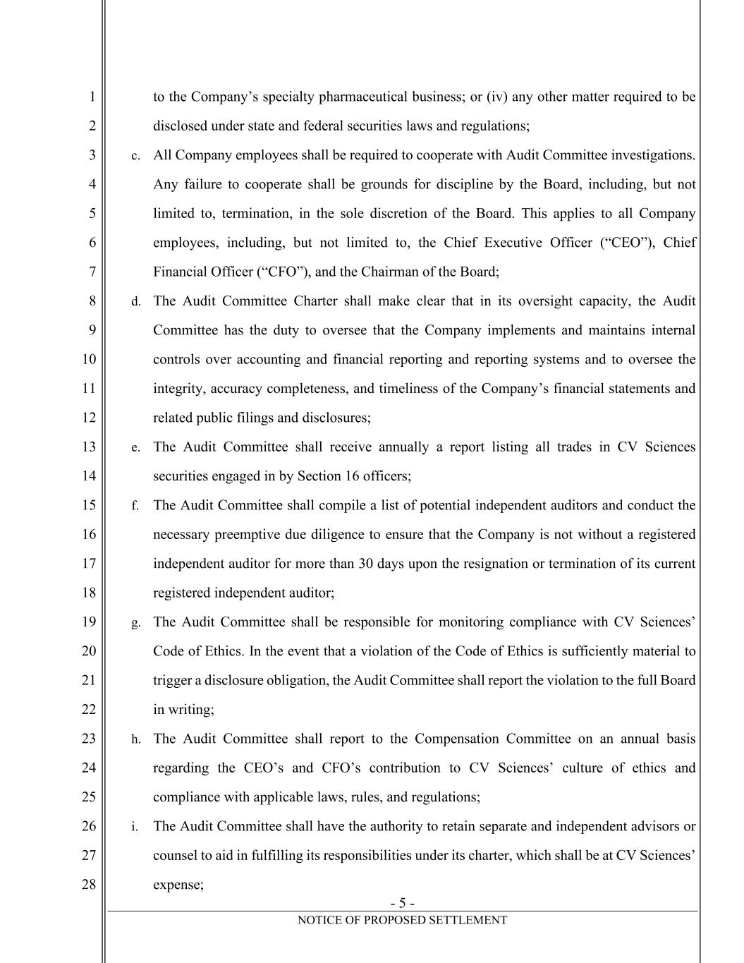 - 5 - NOTICE OF PROPOSED SETTLEMENT 1 2 3 4 5 6 7 8 9 10 11 12 13 14 15 16 17 18 19 20 21 22 23 24 25 26 27 28 to the Company’s specialty pharmaceutical business; or (iv) any other matter required to be disclosed under state and federal securities laws and regulations; c. All Company employees shall be required to cooperate with Audit Committee investigations. Any failure to cooperate shall be grounds for discipline by the Board, including, but not limited to, termination, in the sole discretion of the Board. This applies to all Company employees, including, but not limited to, the Chief Executive Officer (“CEO”), Chief Financial Officer (“CFO”), and the Chairman of the Board; d. The Audit Committee Charter shall make clear that in its oversight capacity, the Audit Committee has the duty to oversee that the Company implements and maintains internal controls over accounting and financial reporting and reporting systems and to oversee the integrity, accuracy completeness, and timeliness of the Company’s financial statements and related public filings and disclosures; e. The Audit Committee shall receive annually a report listing all trades in CV Sciences securities engaged in by Section 16 officers; f. The Audit Committee shall compile a list of potential independent auditors and conduct the necessary preemptive due diligence to ensure that the Company is not without a registered independent auditor for more than 30 days upon the resignation or termination of its current registered independent auditor; g. The Audit Committee shall be responsible for monitoring compliance with CV Sciences’ Code of Ethics. In the event that a violation of the Code of Ethics is sufficiently material to trigger a disclosure obligation, the Audit Committee shall report the violation to the full Board in writing; h. The Audit Committee shall report to the Compensation Committee on an annual basis regarding the CEO’s and CFO’s contribution to CV Sciences’ culture of ethics and compliance with applicable laws, rules, and regulations; i. The Audit Committee shall have the authority to retain separate and independent advisors or counsel to aid in fulfilling its responsibilities under its charter, which shall be at CV Sciences’ expense;