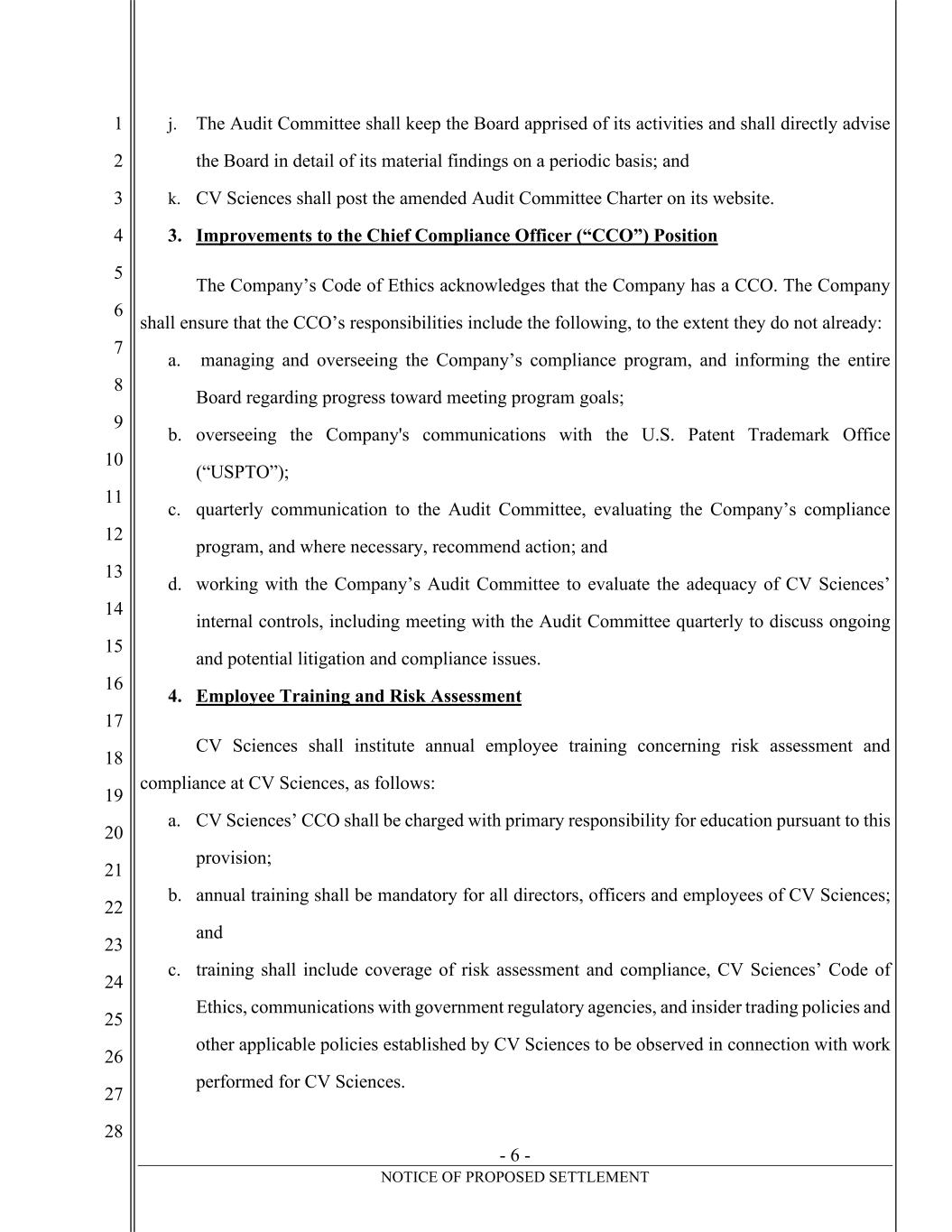 - 6 - NOTICE OF PROPOSED SETTLEMENT 1 2 3 4 5 6 7 8 9 10 11 12 13 14 15 16 17 18 19 20 21 22 23 24 25 26 27 28 j. The Audit Committee shall keep the Board apprised of its activities and shall directly advise the Board in detail of its material findings on a periodic basis; and k. CV Sciences shall post the amended Audit Committee Charter on its website. 3. Improvements to the Chief Compliance Officer (“CCO”) Position The Company’s Code of Ethics acknowledges that the Company has a CCO. The Company shall ensure that the CCO’s responsibilities include the following, to the extent they do not already: a. managing and overseeing the Company’s compliance program, and informing the entire Board regarding progress toward meeting program goals; b. overseeing the Company's communications with the U.S. Patent Trademark Office (“USPTO”); c. quarterly communication to the Audit Committee, evaluating the Company’s compliance program, and where necessary, recommend action; and d. working with the Company’s Audit Committee to evaluate the adequacy of CV Sciences’ internal controls, including meeting with the Audit Committee quarterly to discuss ongoing and potential litigation and compliance issues. 4. Employee Training and Risk Assessment CV Sciences shall institute annual employee training concerning risk assessment and compliance at CV Sciences, as follows: a. CV Sciences’ CCO shall be charged with primary responsibility for education pursuant to this provision; b. annual training shall be mandatory for all directors, officers and employees of CV Sciences; and c. training shall include coverage of risk assessment and compliance, CV Sciences’ Code of Ethics, communications with government regulatory agencies, and insider trading policies and other applicable policies established by CV Sciences to be observed in connection with work performed for CV Sciences.
