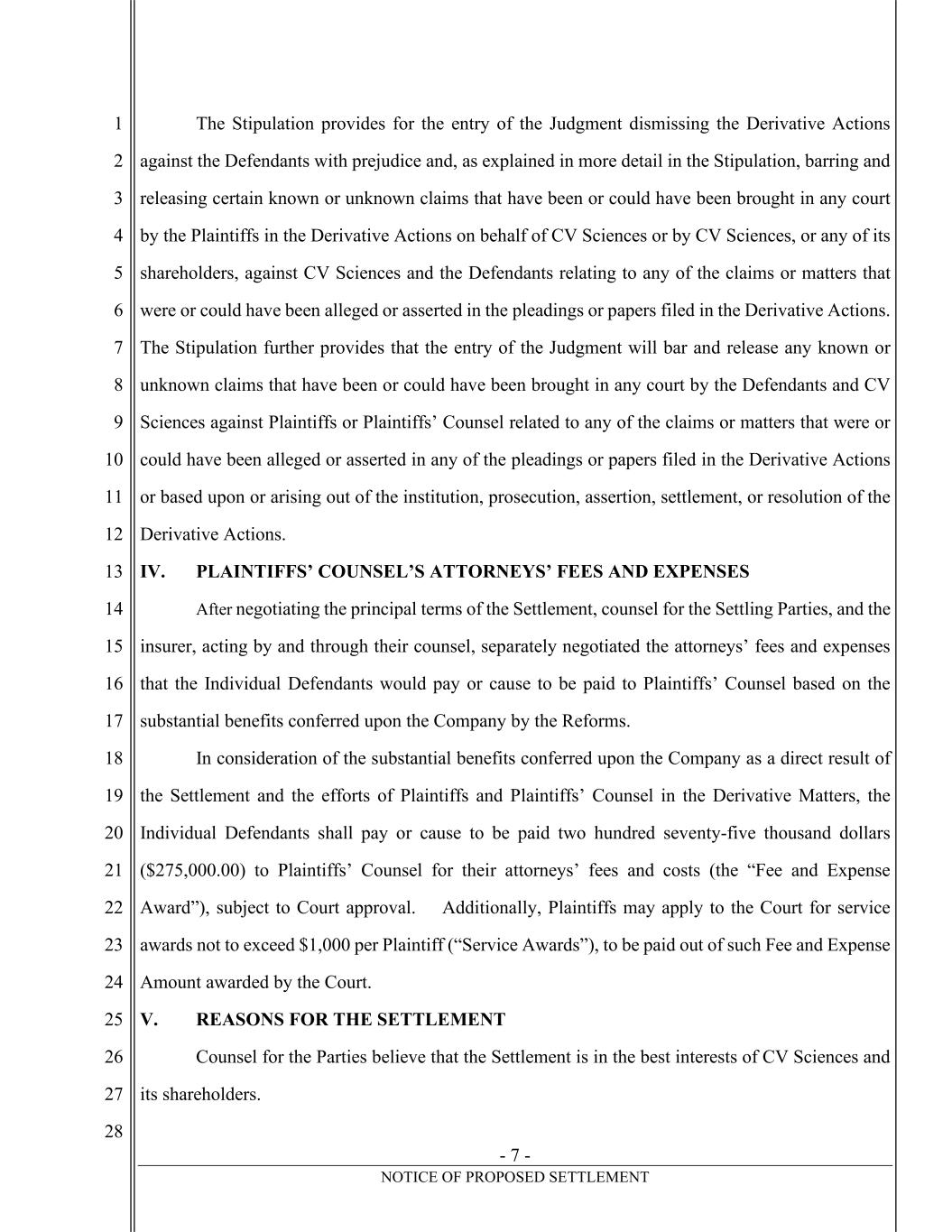 - 7 - NOTICE OF PROPOSED SETTLEMENT 1 2 3 4 5 6 7 8 9 10 11 12 13 14 15 16 17 18 19 20 21 22 23 24 25 26 27 28 The Stipulation provides for the entry of the Judgment dismissing the Derivative Actions against the Defendants with prejudice and, as explained in more detail in the Stipulation, barring and releasing certain known or unknown claims that have been or could have been brought in any court by the Plaintiffs in the Derivative Actions on behalf of CV Sciences or by CV Sciences, or any of its shareholders, against CV Sciences and the Defendants relating to any of the claims or matters that were or could have been alleged or asserted in the pleadings or papers filed in the Derivative Actions. The Stipulation further provides that the entry of the Judgment will bar and release any known or unknown claims that have been or could have been brought in any court by the Defendants and CV Sciences against Plaintiffs or Plaintiffs’ Counsel related to any of the claims or matters that were or could have been alleged or asserted in any of the pleadings or papers filed in the Derivative Actions or based upon or arising out of the institution, prosecution, assertion, settlement, or resolution of the Derivative Actions. IV. PLAINTIFFS’ COUNSEL’S ATTORNEYS’ FEES AND EXPENSES After negotiating the principal terms of the Settlement, counsel for the Settling Parties, and the insurer, acting by and through their counsel, separately negotiated the attorneys’ fees and expenses that the Individual Defendants would pay or cause to be paid to Plaintiffs’ Counsel based on the substantial benefits conferred upon the Company by the Reforms. In consideration of the substantial benefits conferred upon the Company as a direct result of the Settlement and the efforts of Plaintiffs and Plaintiffs’ Counsel in the Derivative Matters, the Individual Defendants shall pay or cause to be paid two hundred seventy-five thousand dollars ($275,000.00) to Plaintiffs’ Counsel for their attorneys’ fees and costs (the “Fee and Expense Award”), subject to Court approval. Additionally, Plaintiffs may apply to the Court for service awards not to exceed $1,000 per Plaintiff (“Service Awards”), to be paid out of such Fee and Expense Amount awarded by the Court. V. REASONS FOR THE SETTLEMENT Counsel for the Parties believe that the Settlement is in the best interests of CV Sciences and its shareholders.