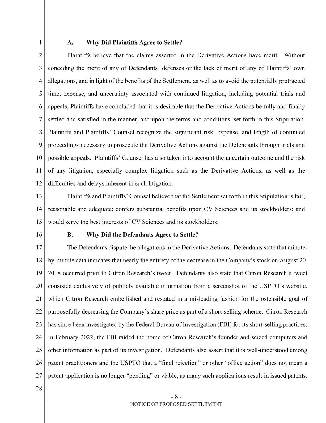 - 8 - NOTICE OF PROPOSED SETTLEMENT 1 2 3 4 5 6 7 8 9 10 11 12 13 14 15 16 17 18 19 20 21 22 23 24 25 26 27 28 A. Why Did Plaintiffs Agree to Settle? Plaintiffs believe that the claims asserted in the Derivative Actions have merit. Without conceding the merit of any of Defendants’ defenses or the lack of merit of any of Plaintiffs’ own allegations, and in light of the benefits of the Settlement, as well as to avoid the potentially protracted time, expense, and uncertainty associated with continued litigation, including potential trials and appeals, Plaintiffs have concluded that it is desirable that the Derivative Actions be fully and finally settled and satisfied in the manner, and upon the terms and conditions, set forth in this Stipulation. Plaintiffs and Plaintiffs’ Counsel recognize the significant risk, expense, and length of continued proceedings necessary to prosecute the Derivative Actions against the Defendants through trials and possible appeals. Plaintiffs’ Counsel has also taken into account the uncertain outcome and the risk of any litigation, especially complex litigation such as the Derivative Actions, as well as the difficulties and delays inherent in such litigation. Plaintiffs and Plaintiffs’ Counsel believe that the Settlement set forth in this Stipulation is fair, reasonable and adequate; confers substantial benefits upon CV Sciences and its stockholders; and would serve the best interests of CV Sciences and its stockholders. B. Why Did the Defendants Agree to Settle? The Defendants dispute the allegations in the Derivative Actions. Defendants state that minute- by-minute data indicates that nearly the entirety of the decrease in the Company’s stock on August 20, 2018 occurred prior to Citron Research’s tweet. Defendants also state that Citron Research’s tweet consisted exclusively of publicly available information from a screenshot of the USPTO’s website, which Citron Research embellished and restated in a misleading fashion for the ostensible goal of purposefully decreasing the Company’s share price as part of a short-selling scheme. Citron Research has since been investigated by the Federal Bureau of Investigation (FBI) for its short-selling practices. In February 2022, the FBI raided the home of Citron Research’s founder and seized computers and other information as part of its investigation. Defendants also assert that it is well-understood among patent practitioners and the USPTO that a “final rejection” or other “office action” does not mean a patent application is no longer “pending” or viable, as many such applications result in issued patents.