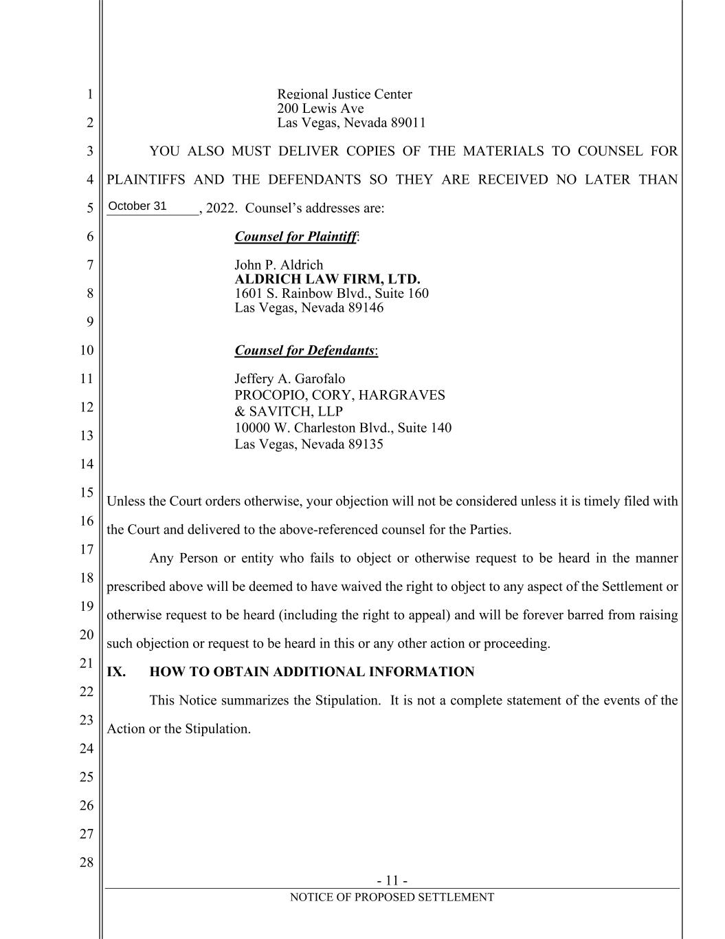 - 11 - NOTICE OF PROPOSED SETTLEMENT 1 2 3 4 5 6 7 8 9 10 11 12 13 14 15 16 17 18 19 20 21 22 23 24 25 26 27 28 Regional Justice Center 200 Lewis Ave Las Vegas, Nevada 89011 YOU ALSO MUST DELIVER COPIES OF THE MATERIALS TO COUNSEL FOR PLAINTIFFS AND THE DEFENDANTS SO THEY ARE RECEIVED NO LATER THAN _____________, 2022. Counsel’s addresses are: Counsel for Plaintiff: John P. Aldrich ALDRICH LAW FIRM, LTD. 1601 S. Rainbow Blvd., Suite 160 Las Vegas, Nevada 89146 Counsel for Defendants: Jeffery A. Garofalo PROCOPIO, CORY, HARGRAVES & SAVITCH, LLP 10000 W. Charleston Blvd., Suite 140 Las Vegas, Nevada 89135 Unless the Court orders otherwise, your objection will not be considered unless it is timely filed with the Court and delivered to the above-referenced counsel for the Parties. Any Person or entity who fails to object or otherwise request to be heard in the manner prescribed above will be deemed to have waived the right to object to any aspect of the Settlement or otherwise request to be heard (including the right to appeal) and will be forever barred from raising such objection or request to be heard in this or any other action or proceeding. IX. HOW TO OBTAIN ADDITIONAL INFORMATION This Notice summarizes the Stipulation. It is not a complete statement of the events of the Action or the Stipulation.