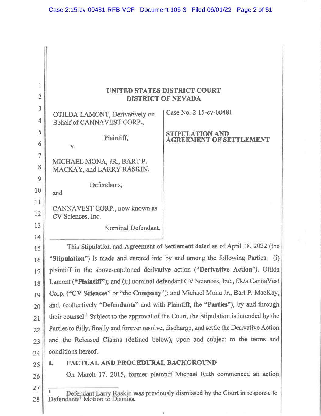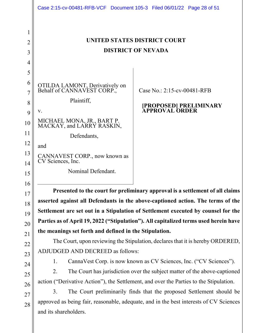 1 2 3 4 5 6 7 8 9 10 11 12 13 14 15 16 17 18 19 20 21 22 23 24 25 26 27 28 Presented to the court for preliminary approval is a settlement of all claims asserted against all Defendants in the above-captioned action. The terms of the Settlement are set out in a Stipulation of Settlement executed by counsel for the Parties as of April 19, 2022 (“Stipulation”). All capitalized terms used herein have the meanings set forth and defined in the Stipulation. The Court, upon reviewing the Stipulation, declares that it is hereby ORDERED, ADJUDGED AND DECREED as follows: 1. CannaVest Corp. is now known as CV Sciences, Inc. (“CV Sciences”). 2. The Court has jurisdiction over the subject matter of the above-captioned action (“Derivative Action”), the Settlement, and over the Parties to the Stipulation. 3. The Court preliminarily finds that the proposed Settlement should be approved as being fair, reasonable, adequate, and in the best interests of CV Sciences and its shareholders. UNITED STATES DISTRICT COURT DISTRICT OF NEVADA OTILDA LAMONT, Derivatively on Behalf of CANNAVEST CORP., Plaintiff, v. MICHAEL MONA, JR., BART P. MACKAY, and LARRY RASKIN, Defendants, and CANNAVEST CORP., now known as CV Sciences, Inc. Nominal Defendant. Case No.: 2:15-cv-00481-RFB [PROPOSED] PRELIMINARY APPROVAL ORDER Case 2:15-cv-00481-RFB-VCF Document 105-3 Filed 06/01/22 Page 28 of 51