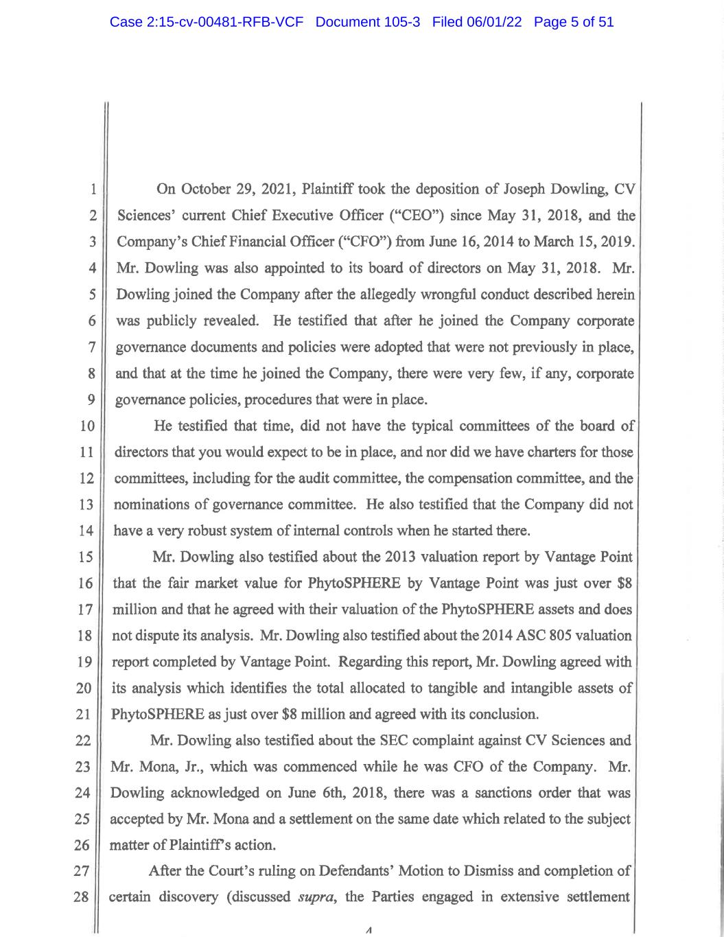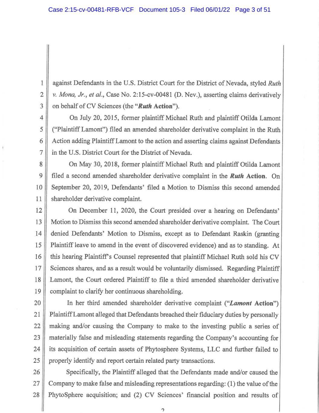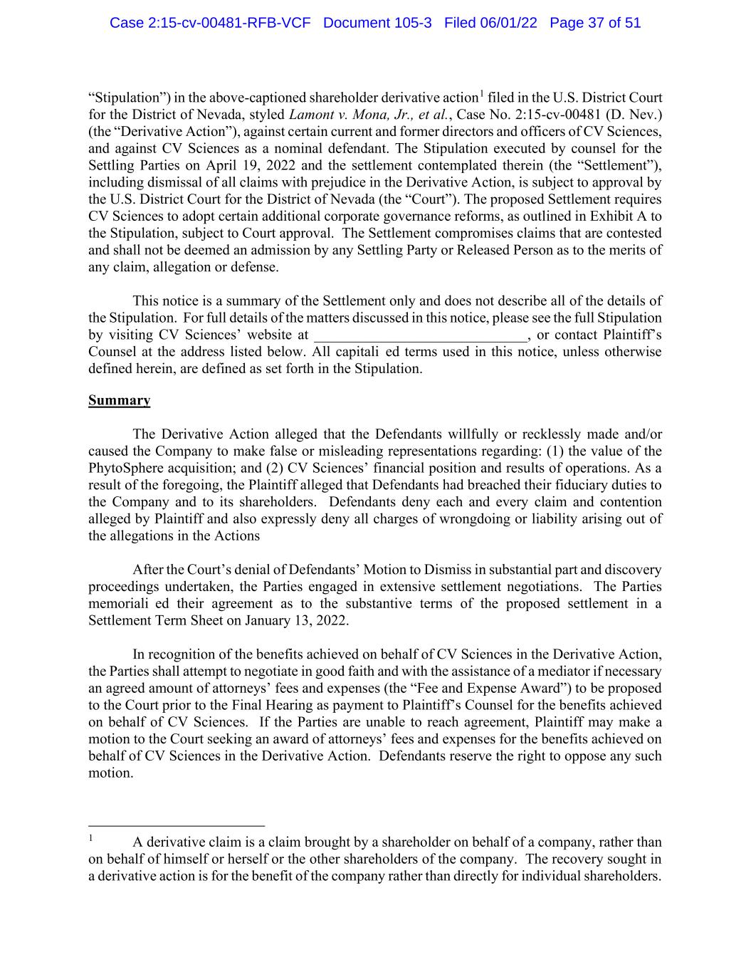 “Stipulation”) in the above-captioned shareholder derivative action1 filed in the U.S. District Court for the District of Nevada, styled Lamont v. Mona, Jr., et al., Case No. 2:15-cv-00481 (D. Nev.) (the “Derivative Action”), against certain current and former directors and officers of CV Sciences, and against CV Sciences as a nominal defendant. The Stipulation executed by counsel for the Settling Parties on April 19, 2022 and the settlement contemplated therein (the “Settlement”), including dismissal of all claims with prejudice in the Derivative Action, is subject to approval by the U.S. District Court for the District of Nevada (the “Court”). The proposed Settlement requires CV Sciences to adopt certain additional corporate governance reforms, as outlined in Exhibit A to the Stipulation, subject to Court approval. The Settlement compromises claims that are contested and shall not be deemed an admission by any Settling Party or Released Person as to the merits of any claim, allegation or defense. This notice is a summary of the Settlement only and does not describe all of the details of the Stipulation. For full details of the matters discussed in this notice, please see the full Stipulation by visiting CV Sciences’ website at _____________________________, or contact Plaintiff’s Counsel at the address listed below. All capitalized terms used in this notice, unless otherwise defined herein, are defined as set forth in the Stipulation. Summary The Derivative Action alleged that the Defendants willfully or recklessly made and/or caused the Company to make false or misleading representations regarding: (1) the value of the PhytoSphere acquisition; and (2) CV Sciences’ financial position and results of operations. As a result of the foregoing, the Plaintiff alleged that Defendants had breached their fiduciary duties to the Company and to its shareholders. Defendants deny each and every claim and contention alleged by Plaintiff and also expressly deny all charges of wrongdoing or liability arising out of the allegations in the Actions After the Court’s denial of Defendants’ Motion to Dismiss in substantial part and discovery proceedings undertaken, the Parties engaged in extensive settlement negotiations. The Parties memorialized their agreement as to the substantive terms of the proposed settlement in a Settlement Term Sheet on January 13, 2022. In recognition of the benefits achieved on behalf of CV Sciences in the Derivative Action, the Parties shall attempt to negotiate in good faith and with the assistance of a mediator if necessary an agreed amount of attorneys’ fees and expenses (the “Fee and Expense Award”) to be proposed to the Court prior to the Final Hearing as payment to Plaintiff’s Counsel for the benefits achieved on behalf of CV Sciences. If the Parties are unable to reach agreement, Plaintiff may make a motion to the Court seeking an award of attorneys’ fees and expenses for the benefits achieved on behalf of CV Sciences in the Derivative Action. Defendants reserve the right to oppose any such motion. 1 A derivative claim is a claim brought by a shareholder on behalf of a company, rather than on behalf of himself or herself or the other shareholders of the company. The recovery sought in a derivative action is for the benefit of the company rather than directly for individual shareholders. Case 2:15-cv-00481-RFB-VCF Document 105-3 Filed 06/01/22 Page 37 of 51