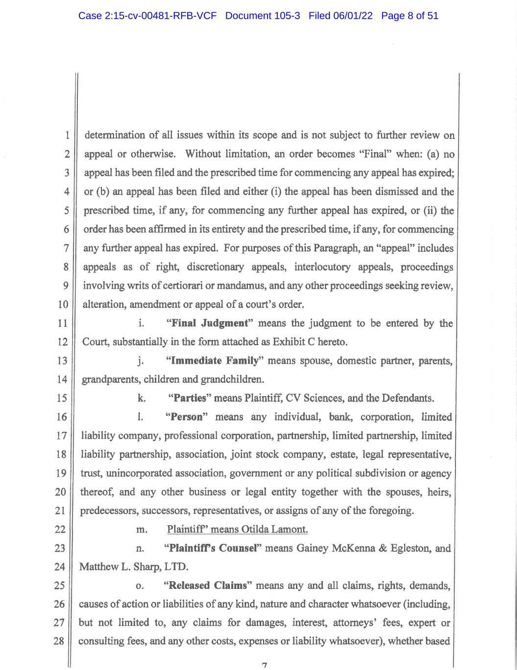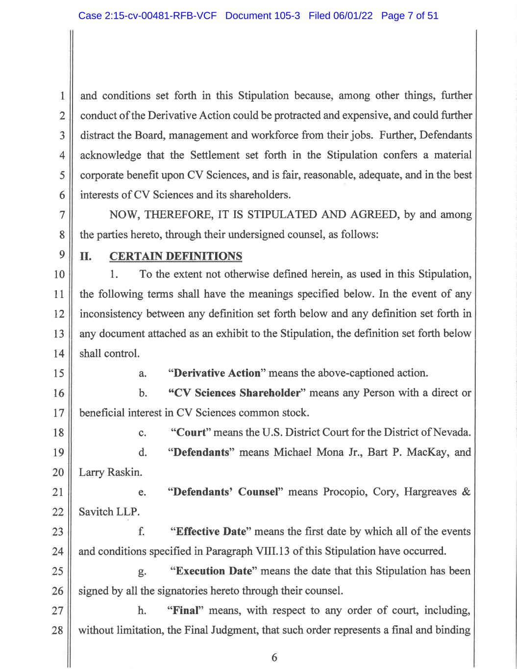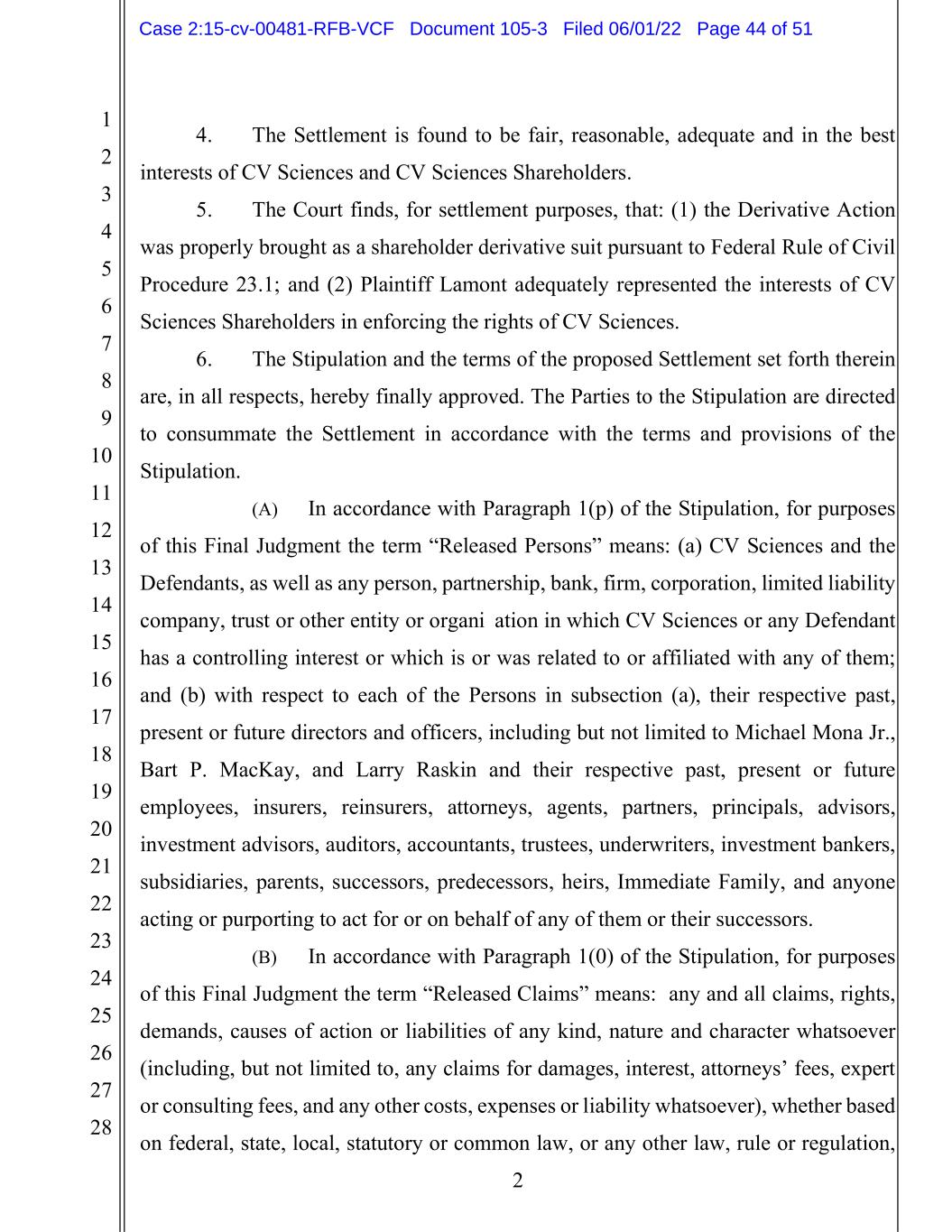1 2 3 4 5 6 7 8 9 10 11 12 13 14 15 16 17 18 19 20 21 22 23 24 25 26 27 28 2 4. The Settlement is found to be fair, reasonable, adequate and in the best interests of CV Sciences and CV Sciences Shareholders. 5. The Court finds, for settlement purposes, that: (1) the Derivative Action was properly brought as a shareholder derivative suit pursuant to Federal Rule of Civil Procedure 23.1; and (2) Plaintiff Lamont adequately represented the interests of CV Sciences Shareholders in enforcing the rights of CV Sciences. 6. The Stipulation and the terms of the proposed Settlement set forth therein are, in all respects, hereby finally approved. The Parties to the Stipulation are directed to consummate the Settlement in accordance with the terms and provisions of the Stipulation. (A) In accordance with Paragraph 1(p) of the Stipulation, for purposes of this Final Judgment the term “Released Persons” means: (a) CV Sciences and the Defendants, as well as any person, partnership, bank, firm, corporation, limited liability company, trust or other entity or organization in which CV Sciences or any Defendant has a controlling interest or which is or was related to or affiliated with any of them; and (b) with respect to each of the Persons in subsection (a), their respective past, present or future directors and officers, including but not limited to Michael Mona Jr., Bart P. MacKay, and Larry Raskin and their respective past, present or future employees, insurers, reinsurers, attorneys, agents, partners, principals, advisors, investment advisors, auditors, accountants, trustees, underwriters, investment bankers, subsidiaries, parents, successors, predecessors, heirs, Immediate Family, and anyone acting or purporting to act for or on behalf of any of them or their successors. (B) In accordance with Paragraph 1(0) of the Stipulation, for purposes of this Final Judgment the term “Released Claims” means: any and all claims, rights, demands, causes of action or liabilities of any kind, nature and character whatsoever (including, but not limited to, any claims for damages, interest, attorneys’ fees, expert or consulting fees, and any other costs, expenses or liability whatsoever), whether based on federal, state, local, statutory or common law, or any other law, rule or regulation, Case 2:15-cv-00481-RFB-VCF Document 105-3 Filed 06/01/22 Page 44 of 51