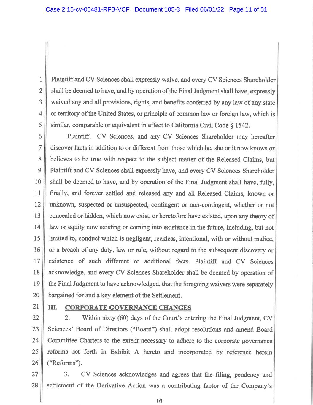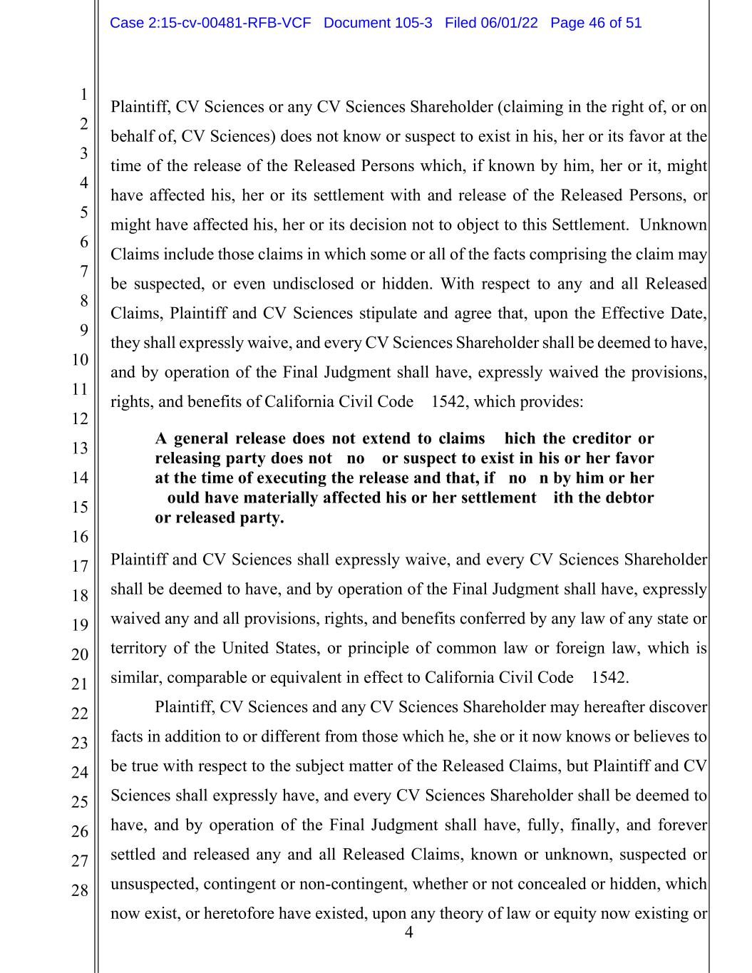 1 2 3 4 5 6 7 8 9 10 11 12 13 14 15 16 17 18 19 20 21 22 23 24 25 26 27 28 4 Plaintiff, CV Sciences or any CV Sciences Shareholder (claiming in the right of, or on behalf of, CV Sciences) does not know or suspect to exist in his, her or its favor at the time of the release of the Released Persons which, if known by him, her or it, might have affected his, her or its settlement with and release of the Released Persons, or might have affected his, her or its decision not to object to this Settlement. Unknown Claims include those claims in which some or all of the facts comprising the claim may be suspected, or even undisclosed or hidden. With respect to any and all Released Claims, Plaintiff and CV Sciences stipulate and agree that, upon the Effective Date, they shall expressly waive, and every CV Sciences Shareholder shall be deemed to have, and by operation of the Final Judgment shall have, expressly waived the provisions, rights, and benefits of California Civil Code § 1542, which provides: A general release does not extend to claims which the creditor or releasing party does not know or suspect to exist in his or her favor at the time of executing the release and that, if known by him or her would have materially affected his or her settlement with the debtor or released party. Plaintiff and CV Sciences shall expressly waive, and every CV Sciences Shareholder shall be deemed to have, and by operation of the Final Judgment shall have, expressly waived any and all provisions, rights, and benefits conferred by any law of any state or territory of the United States, or principle of common law or foreign law, which is similar, comparable or equivalent in effect to California Civil Code § 1542. Plaintiff, CV Sciences and any CV Sciences Shareholder may hereafter discover facts in addition to or different from those which he, she or it now knows or believes to be true with respect to the subject matter of the Released Claims, but Plaintiff and CV Sciences shall expressly have, and every CV Sciences Shareholder shall be deemed to have, and by operation of the Final Judgment shall have, fully, finally, and forever settled and released any and all Released Claims, known or unknown, suspected or unsuspected, contingent or non-contingent, whether or not concealed or hidden, which now exist, or heretofore have existed, upon any theory of law or equity now existing or Case 2:15-cv-00481-RFB-VCF Document 105-3 Filed 06/01/22 Page 46 of 51