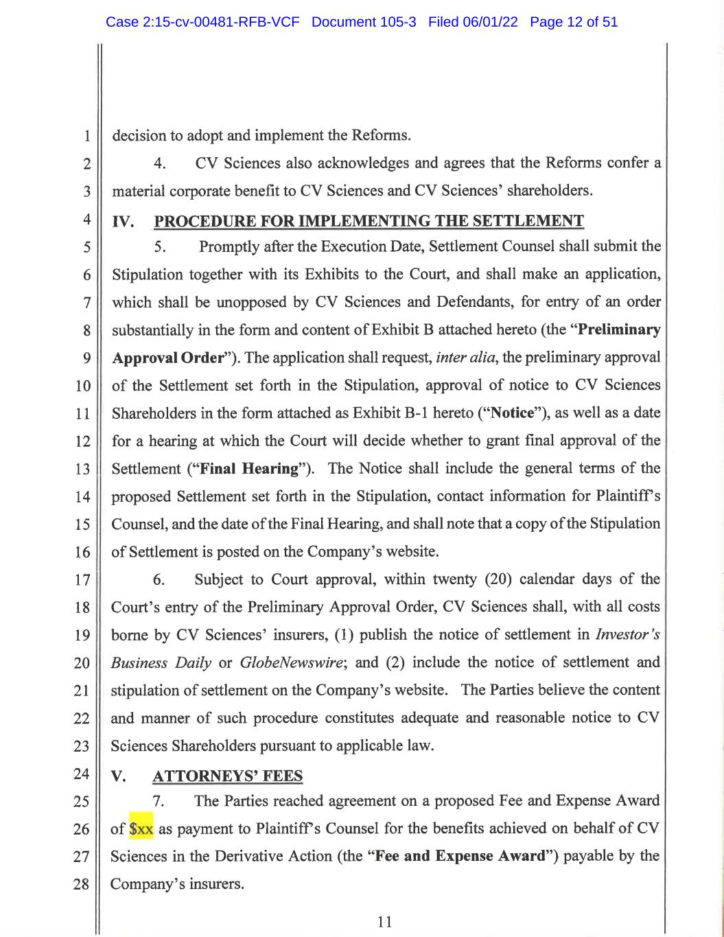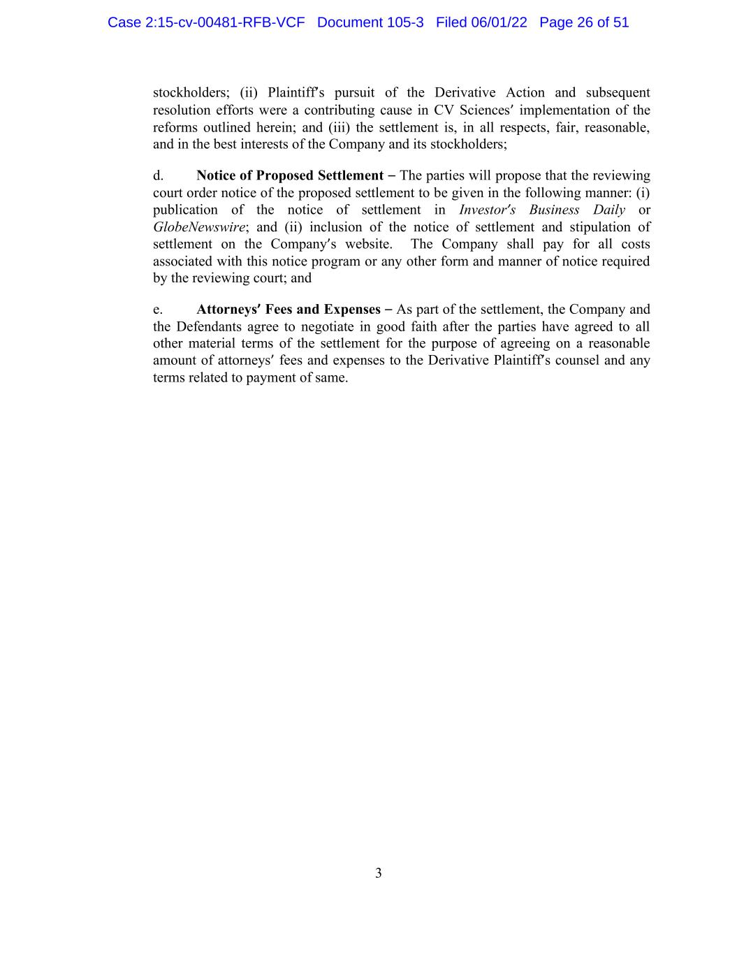 3 stockholders; (ii) Plaintiff’s pursuit of the Derivative Action and subsequent resolution efforts were a contributing cause in CV Sciences’ implementation of the reforms outlined herein; and (iii) the settlement is, in all respects, fair, reasonable, and in the best interests of the Company and its stockholders; d. Notice of Proposed Settlement – The parties will propose that the reviewing court order notice of the proposed settlement to be given in the following manner: (i) publication of the notice of settlement in Investor’s Business Daily or GlobeNewswire; and (ii) inclusion of the notice of settlement and stipulation of settlement on the Company’s website. The Company shall pay for all costs associated with this notice program or any other form and manner of notice required by the reviewing court; and e. Attorneys’ Fees and Expenses – As part of the settlement, the Company and the Defendants agree to negotiate in good faith after the parties have agreed to all other material terms of the settlement for the purpose of agreeing on a reasonable amount of attorneys’ fees and expenses to the Derivative Plaintiff’s counsel and any terms related to payment of same. Case 2:15-cv-00481-RFB-VCF Document 105-3 Filed 06/01/22 Page 26 of 51