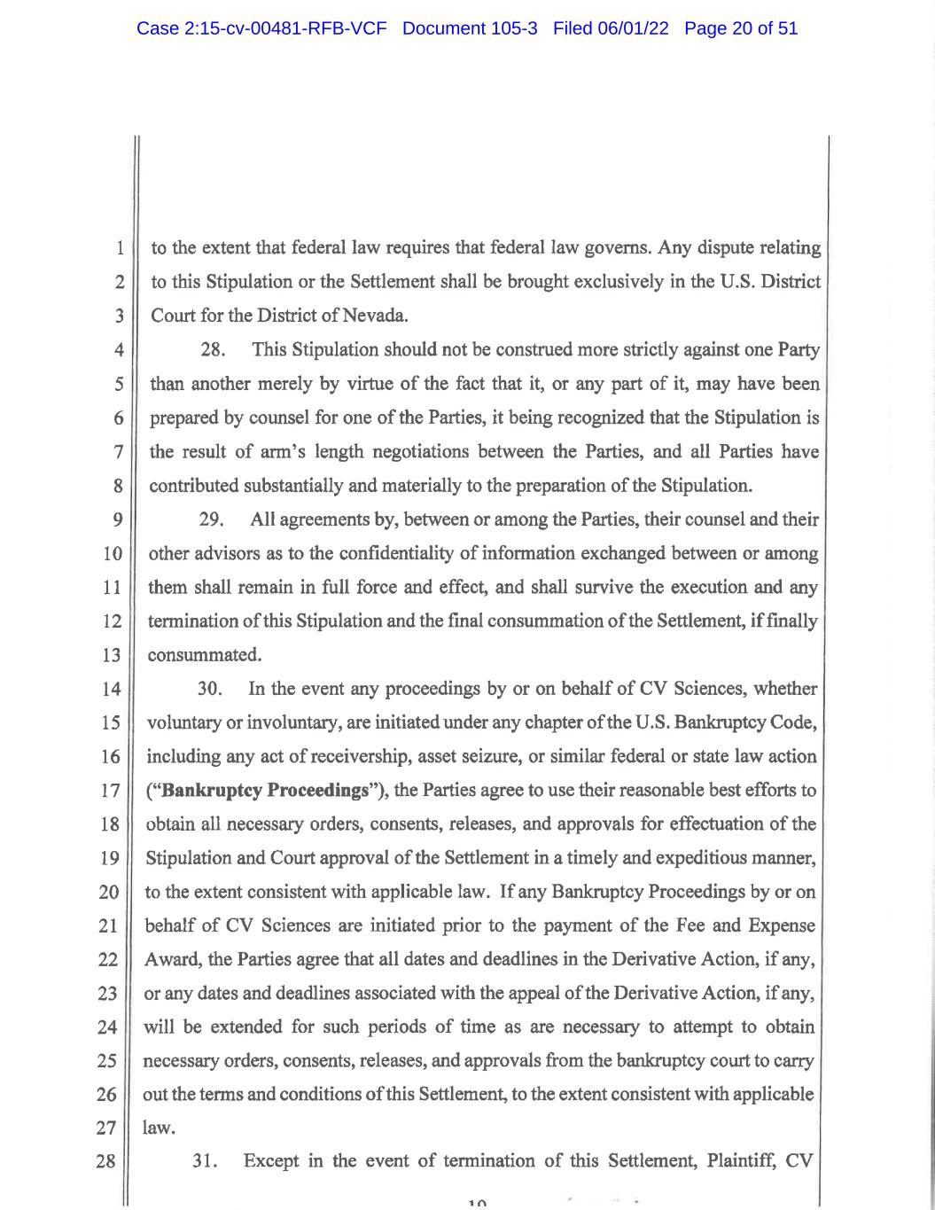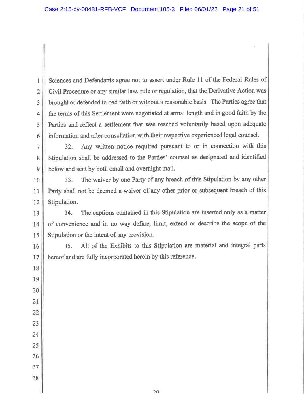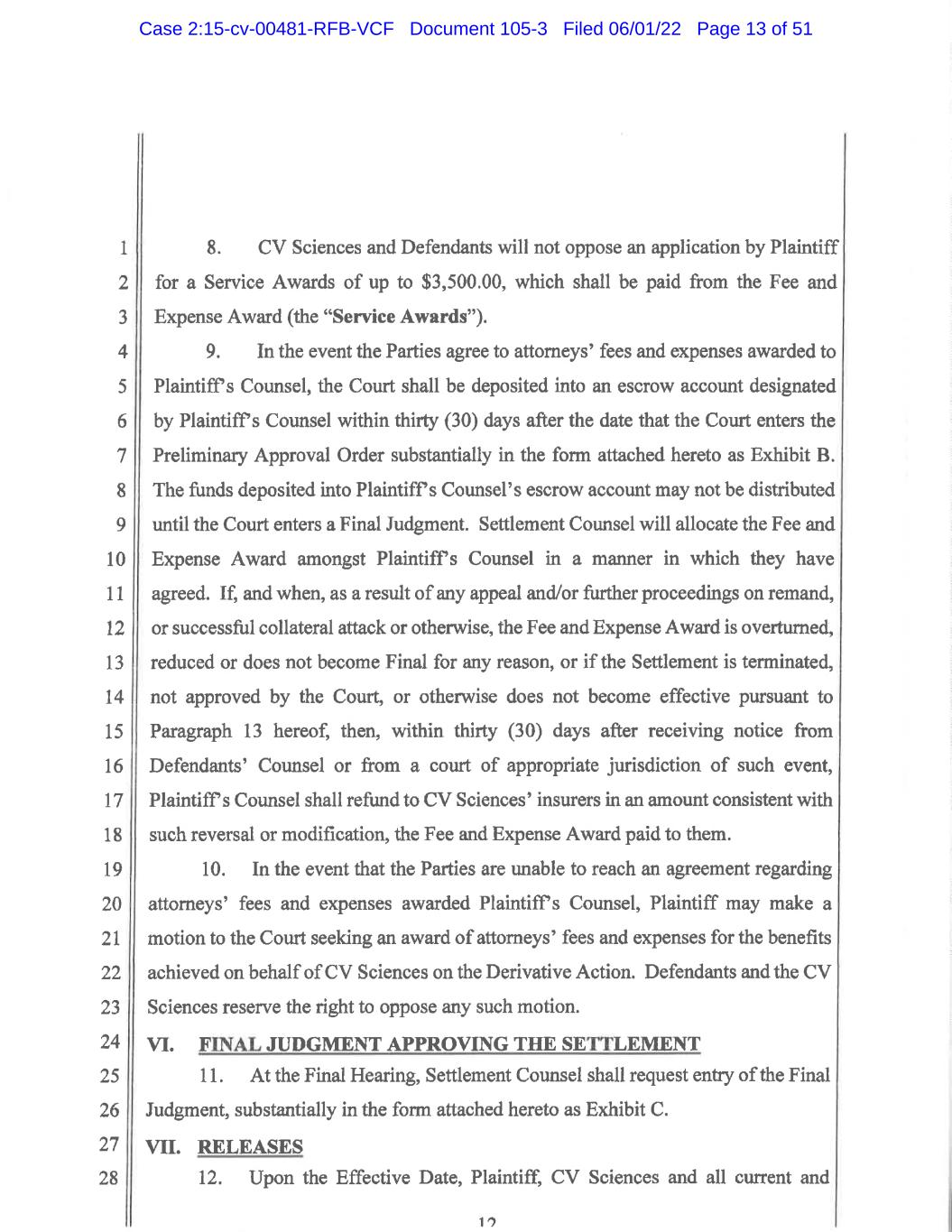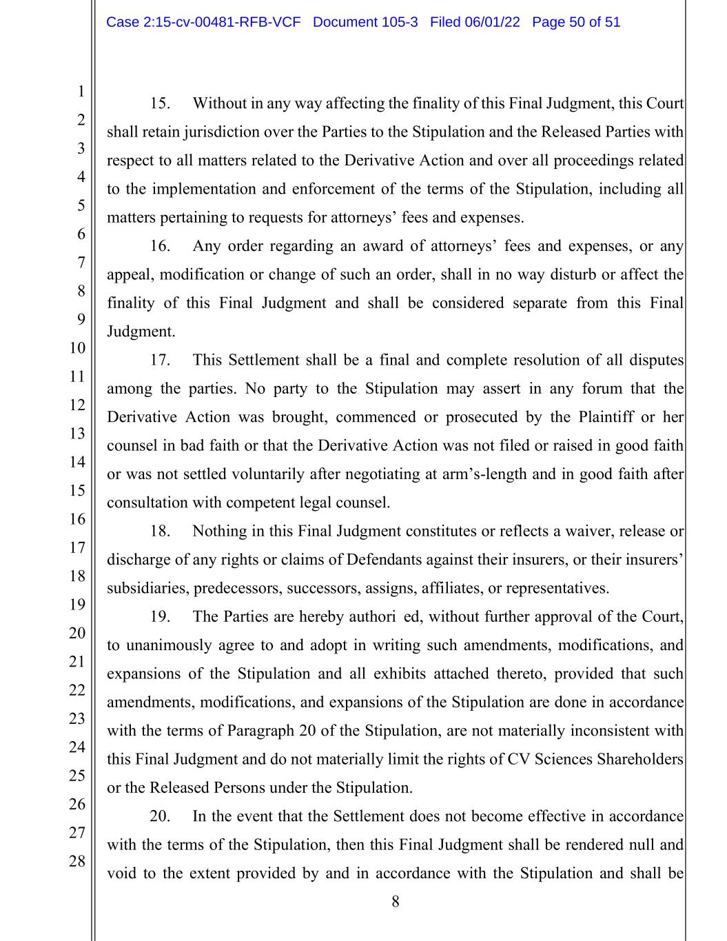 1 2 3 4 5 6 7 8 9 10 11 12 13 14 15 16 17 18 19 20 21 22 23 24 25 26 27 28 8 15. Without in any way affecting the finality of this Final Judgment, this Court shall retain jurisdiction over the Parties to the Stipulation and the Released Parties with respect to all matters related to the Derivative Action and over all proceedings related to the implementation and enforcement of the terms of the Stipulation, including all matters pertaining to requests for attorneys’ fees and expenses. 16. Any order regarding an award of attorneys’ fees and expenses, or any appeal, modification or change of such an order, shall in no way disturb or affect the finality of this Final Judgment and shall be considered separate from this Final Judgment. 17. This Settlement shall be a final and complete resolution of all disputes among the parties. No party to the Stipulation may assert in any forum that the Derivative Action was brought, commenced or prosecuted by the Plaintiff or her counsel in bad faith or that the Derivative Action was not filed or raised in good faith or was not settled voluntarily after negotiating at arm’s-length and in good faith after consultation with competent legal counsel. 18. Nothing in this Final Judgment constitutes or reflects a waiver, release or discharge of any rights or claims of Defendants against their insurers, or their insurers’ subsidiaries, predecessors, successors, assigns, affiliates, or representatives. 19. The Parties are hereby authorized, without further approval of the Court, to unanimously agree to and adopt in writing such amendments, modifications, and expansions of the Stipulation and all exhibits attached thereto, provided that such amendments, modifications, and expansions of the Stipulation are done in accordance with the terms of Paragraph 20 of the Stipulation, are not materially inconsistent with this Final Judgment and do not materially limit the rights of CV Sciences Shareholders or the Released Persons under the Stipulation. 20. In the event that the Settlement does not become effective in accordance with the terms of the Stipulation, then this Final Judgment shall be rendered null and void to the extent provided by and in accordance with the Stipulation and shall be Case 2:15-cv-00481-RFB-VCF Document 105-3 Filed 06/01/22 Page 50 of 51