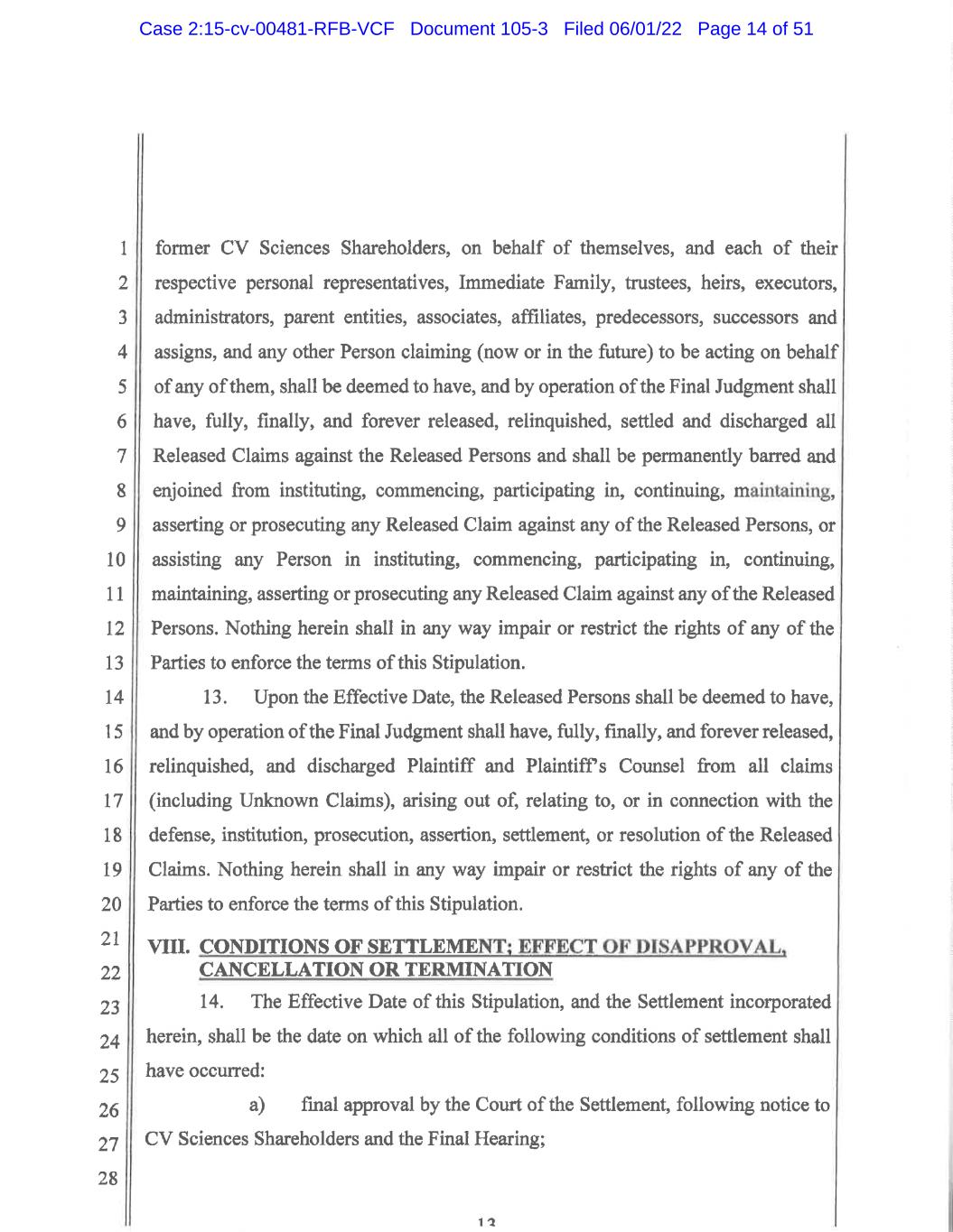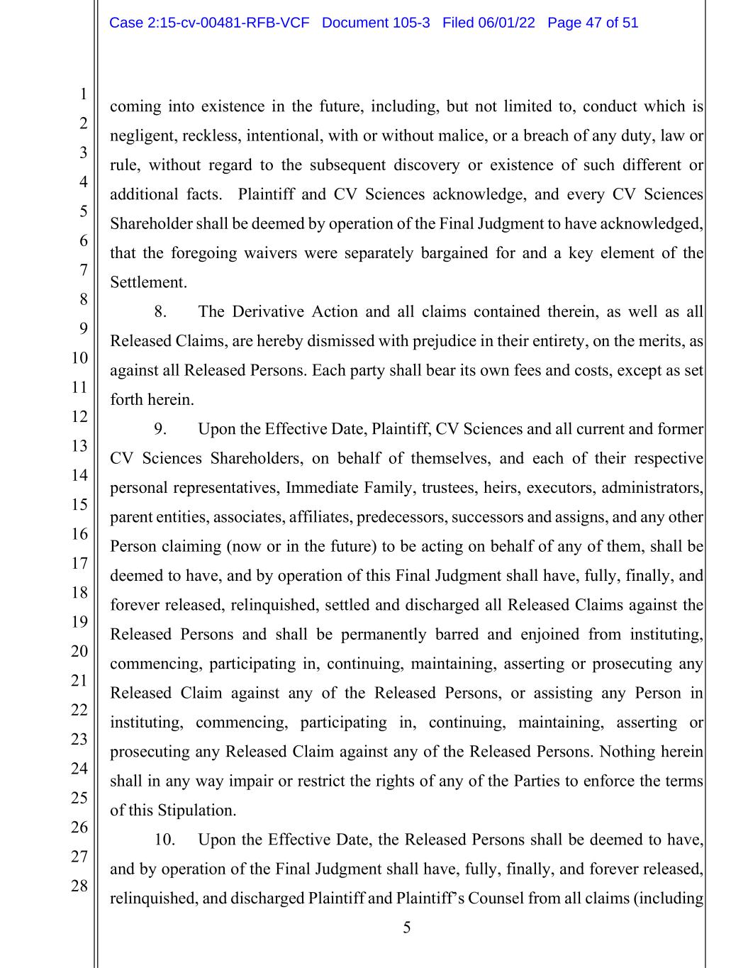 1 2 3 4 5 6 7 8 9 10 11 12 13 14 15 16 17 18 19 20 21 22 23 24 25 26 27 28 5 coming into existence in the future, including, but not limited to, conduct which is negligent, reckless, intentional, with or without malice, or a breach of any duty, law or rule, without regard to the subsequent discovery or existence of such different or additional facts. Plaintiff and CV Sciences acknowledge, and every CV Sciences Shareholder shall be deemed by operation of the Final Judgment to have acknowledged, that the foregoing waivers were separately bargained for and a key element of the Settlement. 8. The Derivative Action and all claims contained therein, as well as all Released Claims, are hereby dismissed with prejudice in their entirety, on the merits, as against all Released Persons. Each party shall bear its own fees and costs, except as set forth herein. 9. Upon the Effective Date, Plaintiff, CV Sciences and all current and former CV Sciences Shareholders, on behalf of themselves, and each of their respective personal representatives, Immediate Family, trustees, heirs, executors, administrators, parent entities, associates, affiliates, predecessors, successors and assigns, and any other Person claiming (now or in the future) to be acting on behalf of any of them, shall be deemed to have, and by operation of this Final Judgment shall have, fully, finally, and forever released, relinquished, settled and discharged all Released Claims against the Released Persons and shall be permanently barred and enjoined from instituting, commencing, participating in, continuing, maintaining, asserting or prosecuting any Released Claim against any of the Released Persons, or assisting any Person in instituting, commencing, participating in, continuing, maintaining, asserting or prosecuting any Released Claim against any of the Released Persons. Nothing herein shall in any way impair or restrict the rights of any of the Parties to enforce the terms of this Stipulation. 10. Upon the Effective Date, the Released Persons shall be deemed to have, and by operation of the Final Judgment shall have, fully, finally, and forever released, relinquished, and discharged Plaintiff and Plaintiff’s Counsel from all claims (including Case 2:15-cv-00481-RFB-VCF Document 105-3 Filed 06/01/22 Page 47 of 51