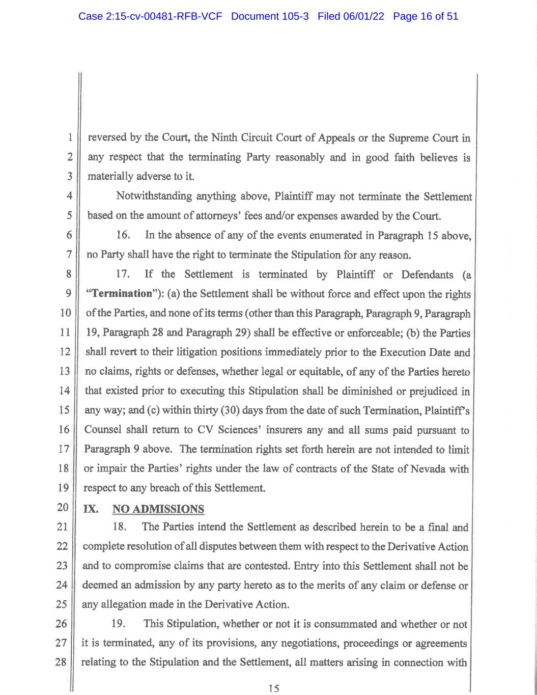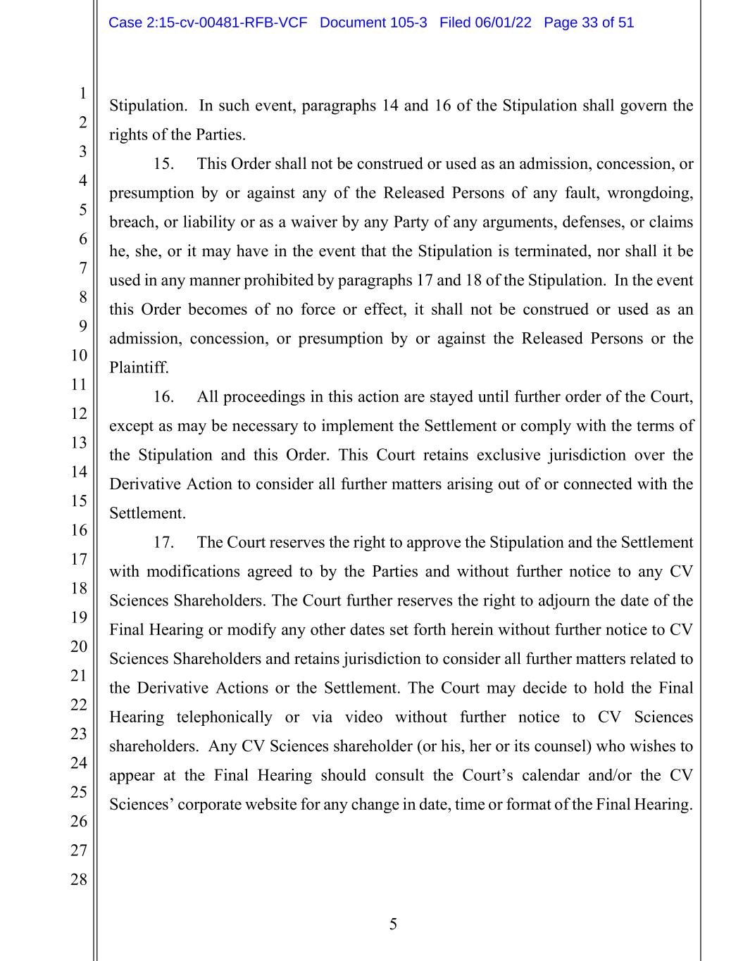 1 2 3 4 5 6 7 8 9 10 11 12 13 14 15 16 17 18 19 20 21 22 23 24 25 26 27 28 5 Stipulation. In such event, paragraphs 14 and 16 of the Stipulation shall govern the rights of the Parties. 15. This Order shall not be construed or used as an admission, concession, or presumption by or against any of the Released Persons of any fault, wrongdoing, breach, or liability or as a waiver by any Party of any arguments, defenses, or claims he, she, or it may have in the event that the Stipulation is terminated, nor shall it be used in any manner prohibited by paragraphs 17 and 18 of the Stipulation. In the event this Order becomes of no force or effect, it shall not be construed or used as an admission, concession, or presumption by or against the Released Persons or the Plaintiff. 16. All proceedings in this action are stayed until further order of the Court, except as may be necessary to implement the Settlement or comply with the terms of the Stipulation and this Order. This Court retains exclusive jurisdiction over the Derivative Action to consider all further matters arising out of or connected with the Settlement. 17. The Court reserves the right to approve the Stipulation and the Settlement with modifications agreed to by the Parties and without further notice to any CV Sciences Shareholders. The Court further reserves the right to adjourn the date of the Final Hearing or modify any other dates set forth herein without further notice to CV Sciences Shareholders and retains jurisdiction to consider all further matters related to the Derivative Actions or the Settlement. The Court may decide to hold the Final Hearing telephonically or via video without further notice to CV Sciences shareholders. Any CV Sciences shareholder (or his, her or its counsel) who wishes to appear at the Final Hearing should consult the Court’s calendar and/or the CV Sciences’ corporate website for any change in date, time or format of the Final Hearing. Case 2:15-cv-00481-RFB-VCF Document 105-3 Filed 06/01/22 Page 33 of 51