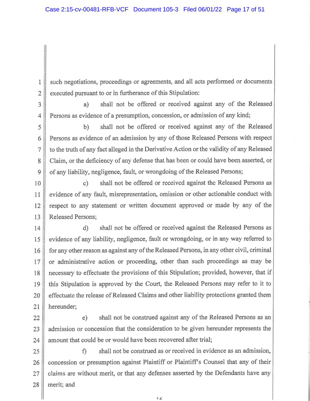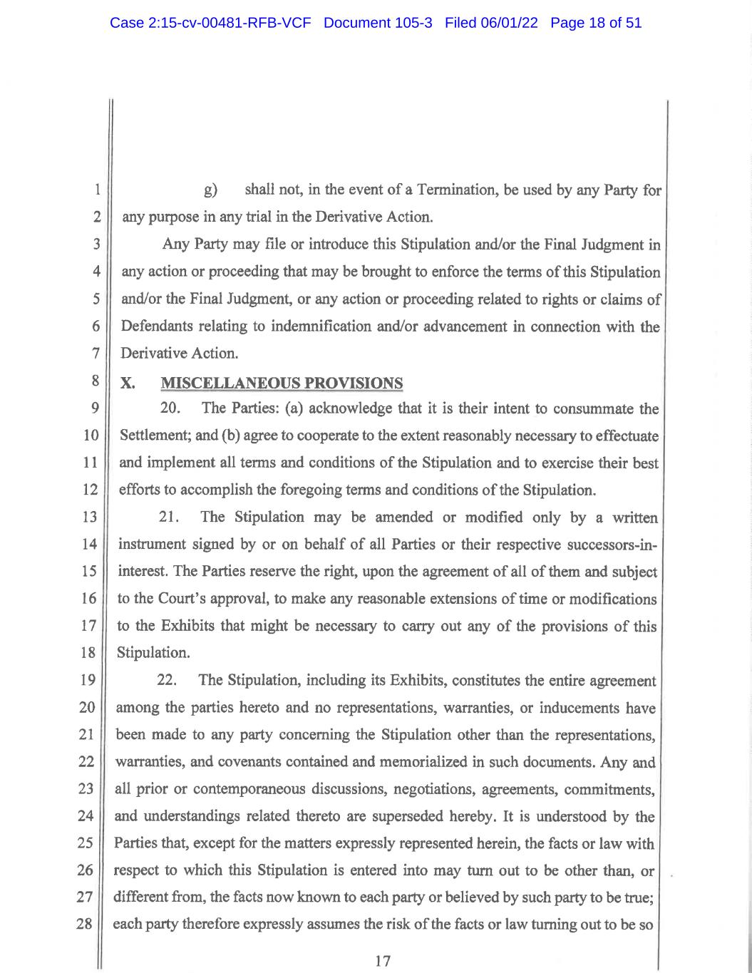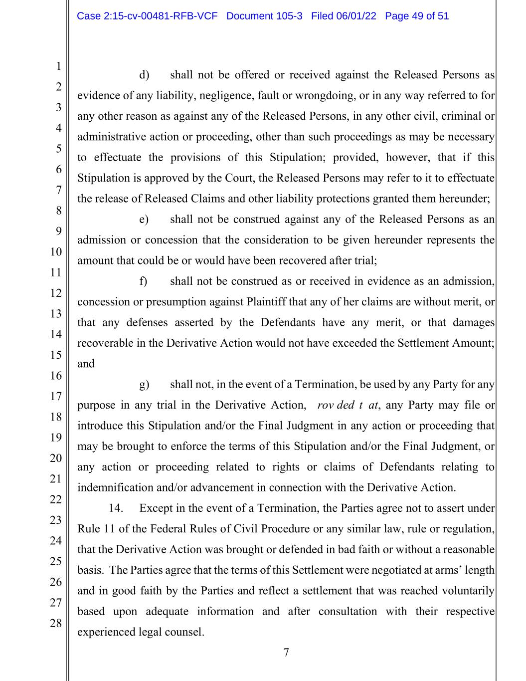 1 2 3 4 5 6 7 8 9 10 11 12 13 14 15 16 17 18 19 20 21 22 23 24 25 26 27 28 7 d) shall not be offered or received against the Released Persons as evidence of any liability, negligence, fault or wrongdoing, or in any way referred to for any other reason as against any of the Released Persons, in any other civil, criminal or administrative action or proceeding, other than such proceedings as may be necessary to effectuate the provisions of this Stipulation; provided, however, that if this Stipulation is approved by the Court, the Released Persons may refer to it to effectuate the release of Released Claims and other liability protections granted them hereunder; e) shall not be construed against any of the Released Persons as an admission or concession that the consideration to be given hereunder represents the amount that could be or would have been recovered after trial; f) shall not be construed as or received in evidence as an admission, concession or presumption against Plaintiff that any of her claims are without merit, or that any defenses asserted by the Defendants have any merit, or that damages recoverable in the Derivative Action would not have exceeded the Settlement Amount; and g) shall not, in the event of a Termination, be used by any Party for any purpose in any trial in the Derivative Action, provided that, any Party may file or introduce this Stipulation and/or the Final Judgment in any action or proceeding that may be brought to enforce the terms of this Stipulation and/or the Final Judgment, or any action or proceeding related to rights or claims of Defendants relating to indemnification and/or advancement in connection with the Derivative Action. 14. Except in the event of a Termination, the Parties agree not to assert under Rule 11 of the Federal Rules of Civil Procedure or any similar law, rule or regulation, that the Derivative Action was brought or defended in bad faith or without a reasonable basis. The Parties agree that the terms of this Settlement were negotiated at arms’ length and in good faith by the Parties and reflect a settlement that was reached voluntarily based upon adequate information and after consultation with their respective experienced legal counsel. Case 2:15-cv-00481-RFB-VCF Document 105-3 Filed 06/01/22 Page 49 of 51
