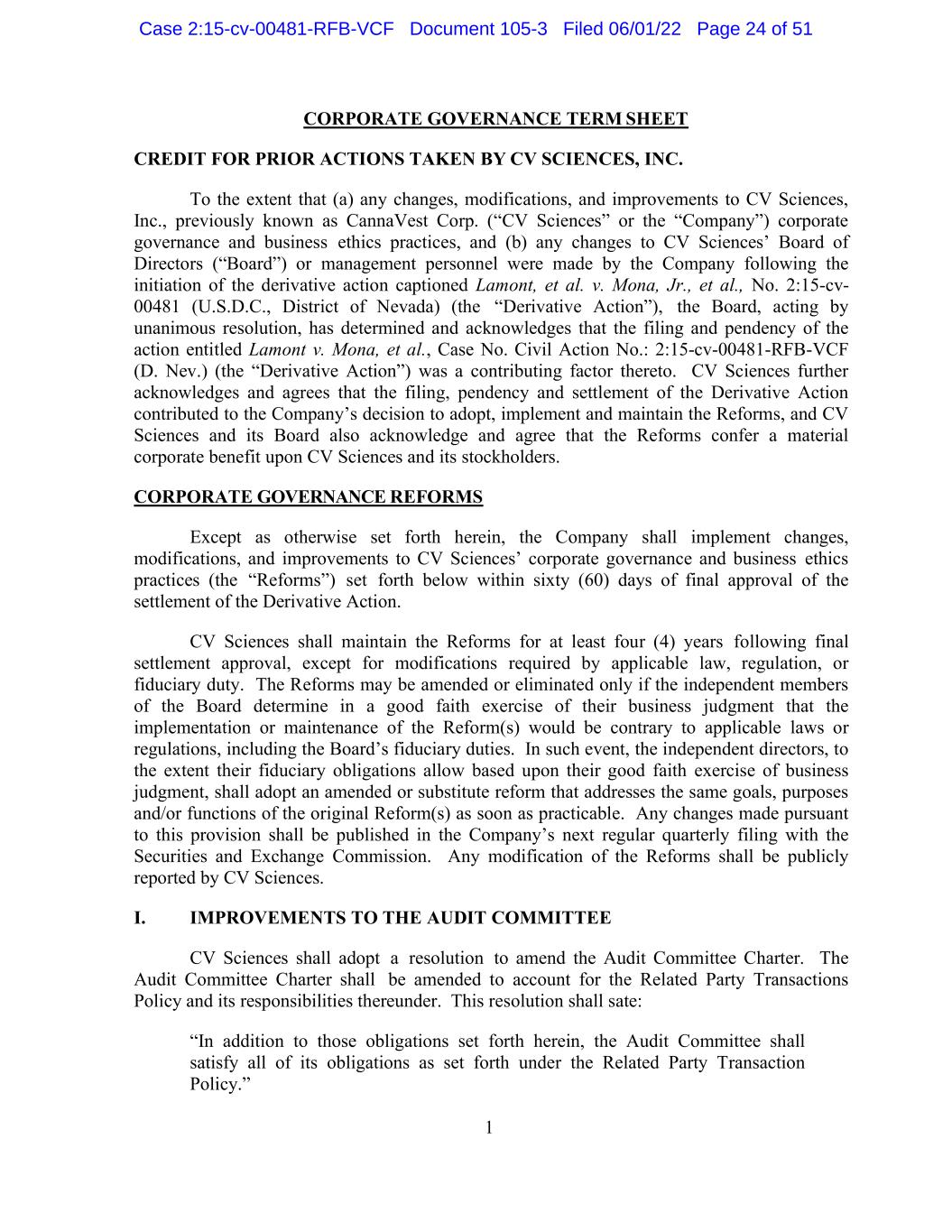 1 CORPORATE GOVERNANCE TERM SHEET CREDIT FOR PRIOR ACTIONS TAKEN BY CV SCIENCES, INC. To the extent that (a) any changes, modifications, and improvements to CV Sciences, Inc., previously known as CannaVest Corp. (“CV Sciences” or the “Company”) corporate governance and business ethics practices, and (b) any changes to CV Sciences’ Board of Directors (“Board”) or management personnel were made by the Company following the initiation of the derivative action captioned Lamont, et al. v. Mona, Jr., et al., No. 2:15-cv- 00481 (U.S.D.C., District of Nevada) (the “Derivative Action”), the Board, acting by unanimous resolution, has determined and acknowledges that the filing and pendency of the action entitled Lamont v. Mona, et al., Case No. Civil Action No.: 2:15-cv-00481-RFB-VCF (D. Nev.) (the “Derivative Action”) was a contributing factor thereto. CV Sciences further acknowledges and agrees that the filing, pendency and settlement of the Derivative Action contributed to the Company’s decision to adopt, implement and maintain the Reforms, and CV Sciences and its Board also acknowledge and agree that the Reforms confer a material corporate benefit upon CV Sciences and its stockholders. CORPORATE GOVERNANCE REFORMS Except as otherwise set forth herein, the Company shall implement changes, modifications, and improvements to CV Sciences’ corporate governance and business ethics practices (the “Reforms”) set forth below within sixty (60) days of final approval of the settlement of the Derivative Action. CV Sciences shall maintain the Reforms for at least four (4) years following final settlement approval, except for modifications required by applicable law, regulation, or fiduciary duty. The Reforms may be amended or eliminated only if the independent members of the Board determine in a good faith exercise of their business judgment that the implementation or maintenance of the Reform(s) would be contrary to applicable laws or regulations, including the Board’s fiduciary duties. In such event, the independent directors, to the extent their fiduciary obligations allow based upon their good faith exercise of business judgment, shall adopt an amended or substitute reform that addresses the same goals, purposes and/or functions of the original Reform(s) as soon as practicable. Any changes made pursuant to this provision shall be published in the Company’s next regular quarterly filing with the Securities and Exchange Commission. Any modification of the Reforms shall be publicly reported by CV Sciences. I. IMPROVEMENTS TO THE AUDIT COMMITTEE CV Sciences shall adopt a resolution to amend the Audit Committee Charter. The Audit Committee Charter shall be amended to account for the Related Party Transactions Policy and its responsibilities thereunder. This resolution shall sate: “In addition to those obligations set forth herein, the Audit Committee shall satisfy all of its obligations as set forth under the Related Party Transaction Policy.” Case 2:15-cv-00481-RFB-VCF Document 105-3 Filed 06/01/22 Page 24 of 51
