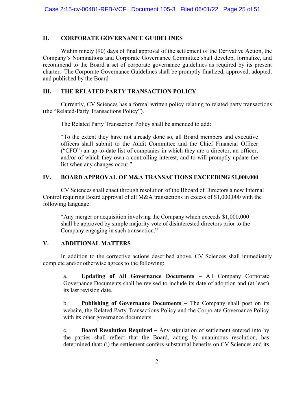 2 II. CORPORATE GOVERNANCE GUIDELINES Within ninety (90) days of final approval of the settlement of the Derivative Action, the Company’s Nominations and Corporate Governance Committee shall develop, formalize, and recommend to the Board a set of corporate governance guidelines as required by its present charter. The Corporate Governance Guidelines shall be promptly finalized, approved, adopted, and published by the Board III. THE RELATED PARTY TRANSACTION POLICY Currently, CV Sciences has a formal written policy relating to related party transactions (the “Related-Party Transactions Policy”). The Related Party Transaction Policy shall be amended to add: “To the extent they have not already done so, all Board members and executive officers shall submit to the Audit Committee and the Chief Financial Officer (“CFO”) an up-to-date list of companies in which they are a director, an officer, and/or of which they own a controlling interest, and to will promptly update the list when any changes occur.” IV. BOARD APPROVAL OF M&A TRANSACTIONS EXCEEDING $1,000,000 CV Sciences shall enact through resolution of the Bboard of Directors a new Internal Control requiring Board approval of all M&A transactions in excess of $1,000,000 with the following language: “Any merger or acquisition involving the Company which exceeds $1,000,000 shall be approved by simple majority vote of disinterested directors prior to the Company engaging in such transaction.” V. ADDITIONAL MATTERS In addition to the corrective actions described above, CV Sciences shall immediately complete and/or otherwise agrees to the following: a. Updating of All Governance Documents – All Company Corporate Governance Documents shall be revised to include its date of adoption and (at least) its last revision date. b. Publishing of Governance Documents – The Company shall post on its website, the Related Party Transactions Policy and the Corporate Governance Policy with its other governance documents. c. Board Resolution Required – Any stipulation of settlement entered into by the parties shall reflect that the Board, acting by unanimous resolution, has determined that: (i) the settlement confers substantial benefits on CV Sciences and its Case 2:15-cv-00481-RFB-VCF Document 105-3 Filed 06/01/22 Page 25 of 51