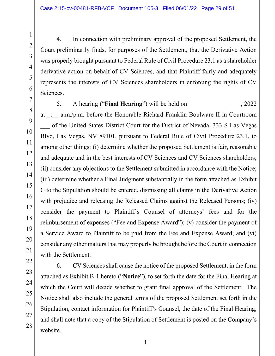 1 2 3 4 5 6 7 8 9 10 11 12 13 14 15 16 17 18 19 20 21 22 23 24 25 26 27 28 1 4. In connection with preliminary approval of the proposed Settlement, the Court preliminarily finds, for purposes of the Settlement, that the Derivative Action was properly brought pursuant to Federal Rule of Civil Procedure 23.1 as a shareholder derivative action on behalf of CV Sciences, and that Plaintiff fairly and adequately represents the interests of CV Sciences shareholders in enforcing the rights of CV Sciences. 5. A hearing (“Final Hearing”) will be held on ____________ ____, 2022 at _:__ a.m./p.m. before the Honorable Richard Franklin Boulware II in Courtroom ___ of the United States District Court for the District of Nevada, 333 S Las Vegas Blvd, Las Vegas, NV 89101, pursuant to Federal Rule of Civil Procedure 23.1, to among other things: (i) determine whether the proposed Settlement is fair, reasonable and adequate and in the best interests of CV Sciences and CV Sciences shareholders; (ii) consider any objections to the Settlement submitted in accordance with the Notice; (iii) determine whether a Final Judgment substantially in the form attached as Exhibit C to the Stipulation should be entered, dismissing all claims in the Derivative Action with prejudice and releasing the Released Claims against the Released Persons; (iv) consider the payment to Plaintiff’s Counsel of attorneys’ fees and for the reimbursement of expenses (“Fee and Expense Award”); (v) consider the payment of a Service Award to Plaintiff to be paid from the Fee and Expense Award; and (vi) consider any other matters that may properly be brought before the Court in connection with the Settlement. 6. CV Sciences shall cause the notice of the proposed Settlement, in the form attached as Exhibit B-1 hereto (“Notice”), to set forth the date for the Final Hearing at which the Court will decide whether to grant final approval of the Settlement. The Notice shall also include the general terms of the proposed Settlement set forth in the Stipulation, contact information for Plaintiff’s Counsel, the date of the Final Hearing, and shall note that a copy of the Stipulation of Settlement is posted on the Company’s website. Case 2:15-cv-00481-RFB-VCF Document 105-3 Filed 06/01/22 Page 29 of 51