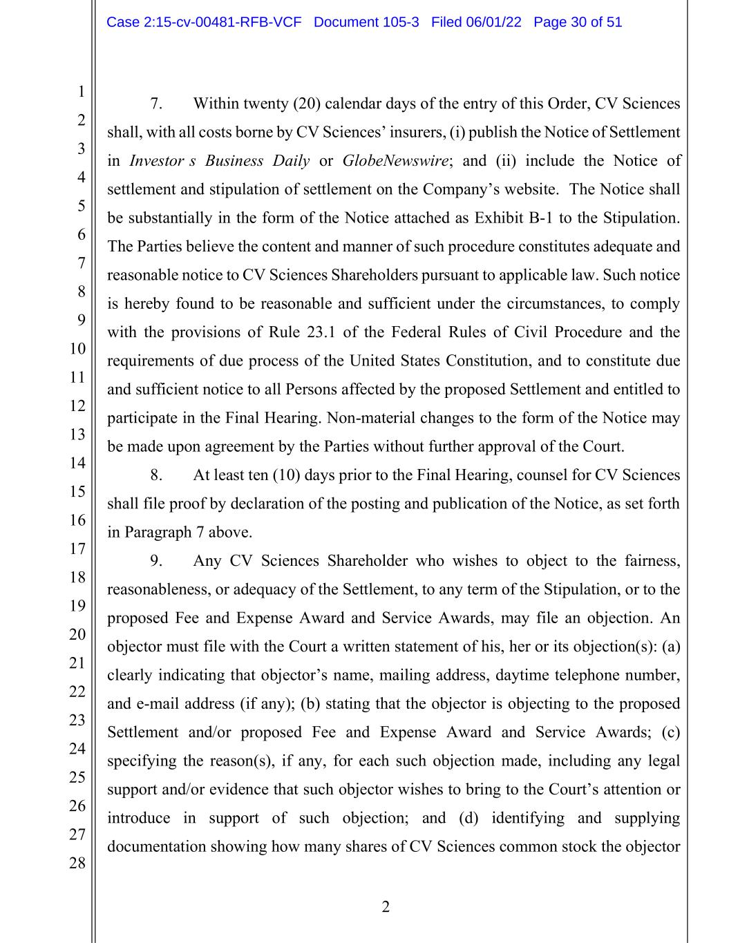 1 2 3 4 5 6 7 8 9 10 11 12 13 14 15 16 17 18 19 20 21 22 23 24 25 26 27 28 2 7. Within twenty (20) calendar days of the entry of this Order, CV Sciences shall, with all costs borne by CV Sciences’ insurers, (i) publish the Notice of Settlement in Investor’s Business Daily or GlobeNewswire; and (ii) include the Notice of settlement and stipulation of settlement on the Company’s website. The Notice shall be substantially in the form of the Notice attached as Exhibit B-1 to the Stipulation. The Parties believe the content and manner of such procedure constitutes adequate and reasonable notice to CV Sciences Shareholders pursuant to applicable law. Such notice is hereby found to be reasonable and sufficient under the circumstances, to comply with the provisions of Rule 23.1 of the Federal Rules of Civil Procedure and the requirements of due process of the United States Constitution, and to constitute due and sufficient notice to all Persons affected by the proposed Settlement and entitled to participate in the Final Hearing. Non-material changes to the form of the Notice may be made upon agreement by the Parties without further approval of the Court. 8. At least ten (10) days prior to the Final Hearing, counsel for CV Sciences shall file proof by declaration of the posting and publication of the Notice, as set forth in Paragraph 7 above. 9. Any CV Sciences Shareholder who wishes to object to the fairness, reasonableness, or adequacy of the Settlement, to any term of the Stipulation, or to the proposed Fee and Expense Award and Service Awards, may file an objection. An objector must file with the Court a written statement of his, her or its objection(s): (a) clearly indicating that objector’s name, mailing address, daytime telephone number, and e-mail address (if any); (b) stating that the objector is objecting to the proposed Settlement and/or proposed Fee and Expense Award and Service Awards; (c) specifying the reason(s), if any, for each such objection made, including any legal support and/or evidence that such objector wishes to bring to the Court’s attention or introduce in support of such objection; and (d) identifying and supplying documentation showing how many shares of CV Sciences common stock the objector Case 2:15-cv-00481-RFB-VCF Document 105-3 Filed 06/01/22 Page 30 of 51