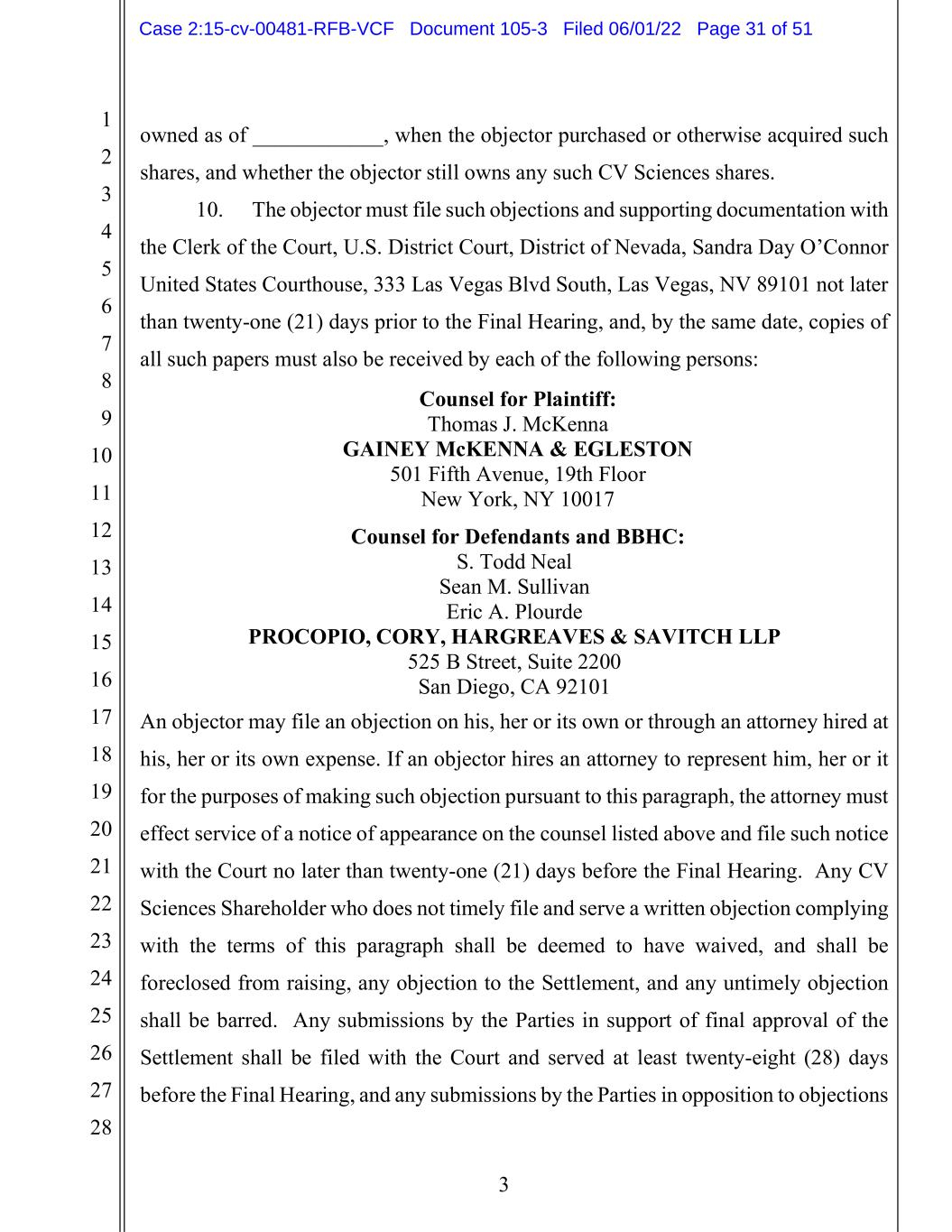 1 2 3 4 5 6 7 8 9 10 11 12 13 14 15 16 17 18 19 20 21 22 23 24 25 26 27 28 3 owned as of ____________, when the objector purchased or otherwise acquired such shares, and whether the objector still owns any such CV Sciences shares. 10. The objector must file such objections and supporting documentation with the Clerk of the Court, U.S. District Court, District of Nevada, Sandra Day O’Connor United States Courthouse, 333 Las Vegas Blvd South, Las Vegas, NV 89101 not later than twenty-one (21) days prior to the Final Hearing, and, by the same date, copies of all such papers must also be received by each of the following persons: Counsel for Plaintiff: Thomas J. McKenna GAINEY McKENNA & EGLESTON 501 Fifth Avenue, 19th Floor New York, NY 10017 Counsel for Defendants and BBHC: S. Todd Neal Sean M. Sullivan Eric A. Plourde PROCOPIO, CORY, HARGREAVES & SAVITCH LLP 525 B Street, Suite 2200 San Diego, CA 92101 An objector may file an objection on his, her or its own or through an attorney hired at his, her or its own expense. If an objector hires an attorney to represent him, her or it for the purposes of making such objection pursuant to this paragraph, the attorney must effect service of a notice of appearance on the counsel listed above and file such notice with the Court no later than twenty-one (21) days before the Final Hearing. Any CV Sciences Shareholder who does not timely file and serve a written objection complying with the terms of this paragraph shall be deemed to have waived, and shall be foreclosed from raising, any objection to the Settlement, and any untimely objection shall be barred. Any submissions by the Parties in support of final approval of the Settlement shall be filed with the Court and served at least twenty-eight (28) days before the Final Hearing, and any submissions by the Parties in opposition to objections Case 2:15-cv-00481-RFB-VCF Document 105-3 Filed 06/01/22 Page 31 of 51