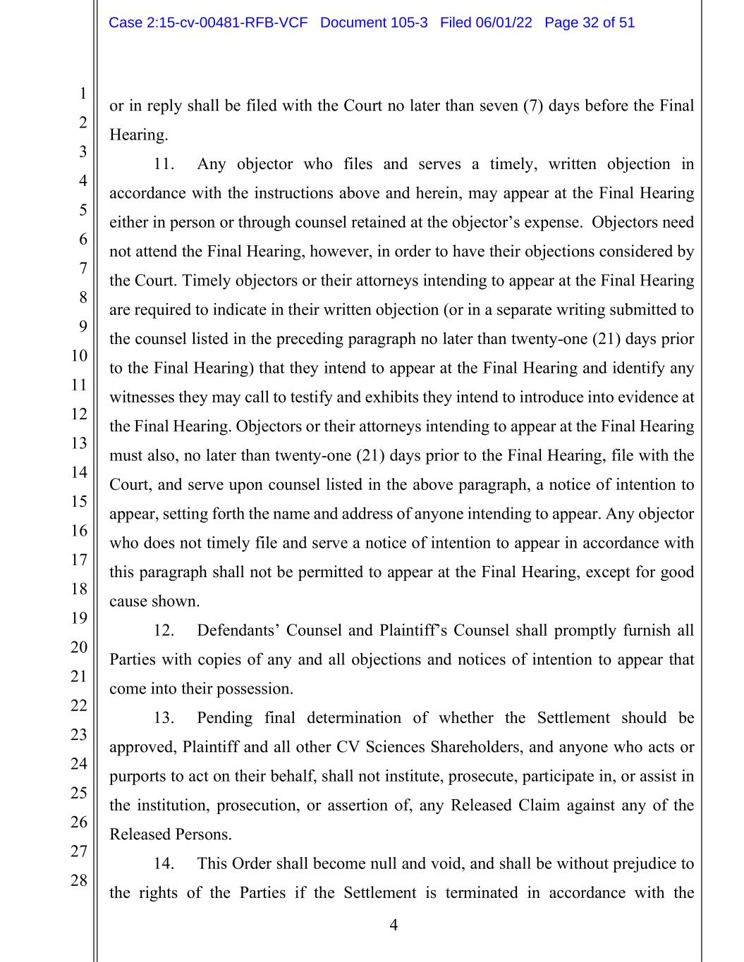 1 2 3 4 5 6 7 8 9 10 11 12 13 14 15 16 17 18 19 20 21 22 23 24 25 26 27 28 4 or in reply shall be filed with the Court no later than seven (7) days before the Final Hearing. 11. Any objector who files and serves a timely, written objection in accordance with the instructions above and herein, may appear at the Final Hearing either in person or through counsel retained at the objector’s expense. Objectors need not attend the Final Hearing, however, in order to have their objections considered by the Court. Timely objectors or their attorneys intending to appear at the Final Hearing are required to indicate in their written objection (or in a separate writing submitted to the counsel listed in the preceding paragraph no later than twenty-one (21) days prior to the Final Hearing) that they intend to appear at the Final Hearing and identify any witnesses they may call to testify and exhibits they intend to introduce into evidence at the Final Hearing. Objectors or their attorneys intending to appear at the Final Hearing must also, no later than twenty-one (21) days prior to the Final Hearing, file with the Court, and serve upon counsel listed in the above paragraph, a notice of intention to appear, setting forth the name and address of anyone intending to appear. Any objector who does not timely file and serve a notice of intention to appear in accordance with this paragraph shall not be permitted to appear at the Final Hearing, except for good cause shown. 12. Defendants’ Counsel and Plaintiff’s Counsel shall promptly furnish all Parties with copies of any and all objections and notices of intention to appear that come into their possession. 13. Pending final determination of whether the Settlement should be approved, Plaintiff and all other CV Sciences Shareholders, and anyone who acts or purports to act on their behalf, shall not institute, prosecute, participate in, or assist in the institution, prosecution, or assertion of, any Released Claim against any of the Released Persons. 14. This Order shall become null and void, and shall be without prejudice to the rights of the Parties if the Settlement is terminated in accordance with the Case 2:15-cv-00481-RFB-VCF Document 105-3 Filed 06/01/22 Page 32 of 51