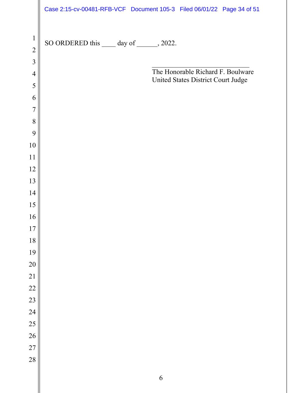 1 2 3 4 5 6 7 8 9 10 11 12 13 14 15 16 17 18 19 20 21 22 23 24 25 26 27 28 6 SO ORDERED this ____ day of ______, 2022. ____________________________ The Honorable Richard F. Boulware United States District Court Judge Case 2:15-cv-00481-RFB-VCF Document 105-3 Filed 06/01/22 Page 34 of 51
