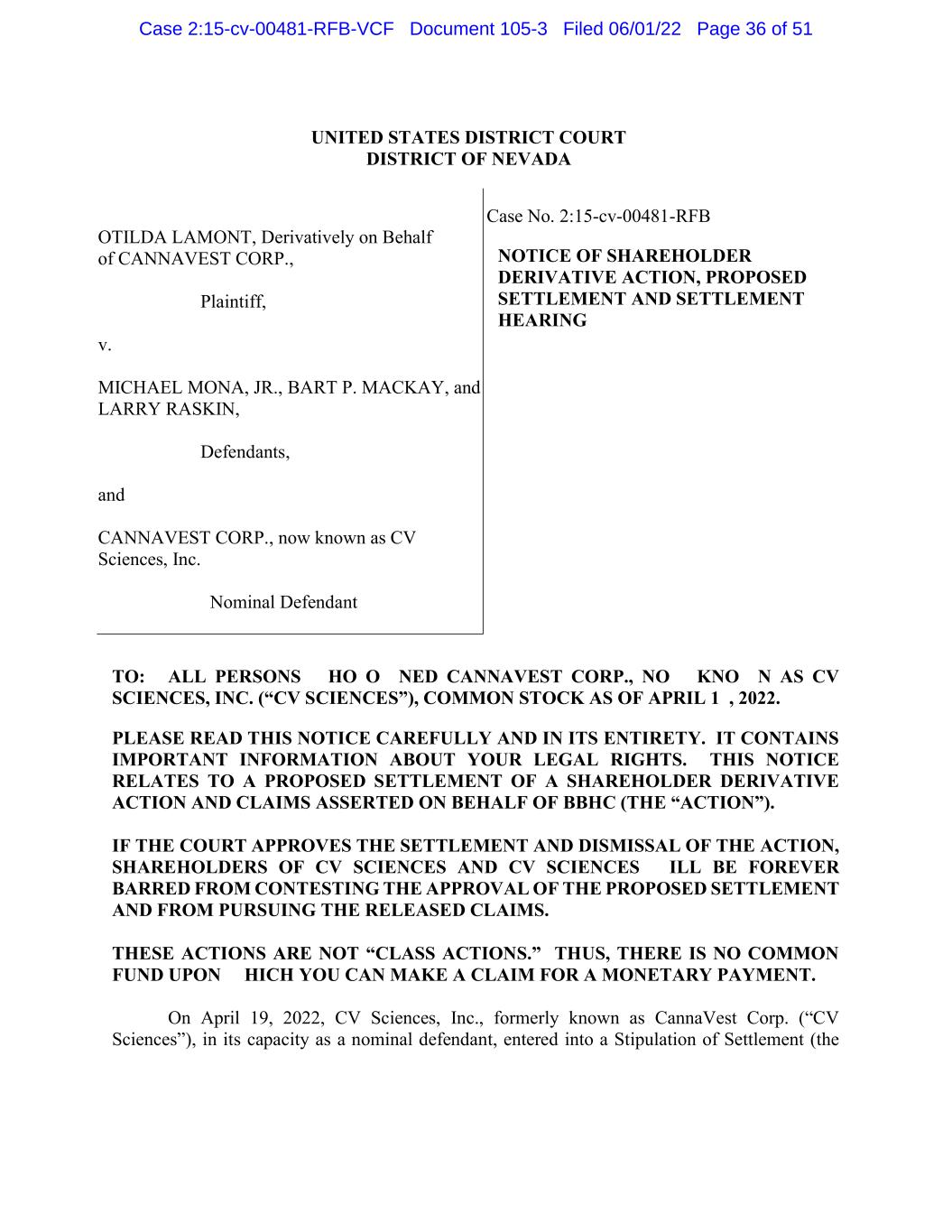 TO: ALL PERSONS WHO OWNED CANNAVEST CORP., NOW KNOWN AS CV SCIENCES, INC. (“CV SCIENCES”), COMMON STOCK AS OF APRIL 18, 2022. PLEASE READ THIS NOTICE CAREFULLY AND IN ITS ENTIRETY. IT CONTAINS IMPORTANT INFORMATION ABOUT YOUR LEGAL RIGHTS. THIS NOTICE RELATES TO A PROPOSED SETTLEMENT OF A SHAREHOLDER DERIVATIVE ACTION AND CLAIMS ASSERTED ON BEHALF OF BBHC (THE “ACTION”). IF THE COURT APPROVES THE SETTLEMENT AND DISMISSAL OF THE ACTION, SHAREHOLDERS OF CV SCIENCES AND CV SCIENCES WILL BE FOREVER BARRED FROM CONTESTING THE APPROVAL OF THE PROPOSED SETTLEMENT AND FROM PURSUING THE RELEASED CLAIMS. THESE ACTIONS ARE NOT “CLASS ACTIONS.” THUS, THERE IS NO COMMON FUND UPON WHICH YOU CAN MAKE A CLAIM FOR A MONETARY PAYMENT. On April 19, 2022, CV Sciences, Inc., formerly known as CannaVest Corp. (“CV Sciences”), in its capacity as a nominal defendant, entered into a Stipulation of Settlement (the UNITED STATES DISTRICT COURT DISTRICT OF NEVADA OTILDA LAMONT, Derivatively on Behalf of CANNAVEST CORP., Plaintiff, v. MICHAEL MONA, JR., BART P. MACKAY, and LARRY RASKIN, Defendants, and CANNAVEST CORP., now known as CV Sciences, Inc. Nominal Defendant Case No. 2:15-cv-00481-RFB NOTICE OF SHAREHOLDER DERIVATIVE ACTION, PROPOSED SETTLEMENT AND SETTLEMENT HEARING Case 2:15-cv-00481-RFB-VCF Document 105-3 Filed 06/01/22 Page 36 of 51