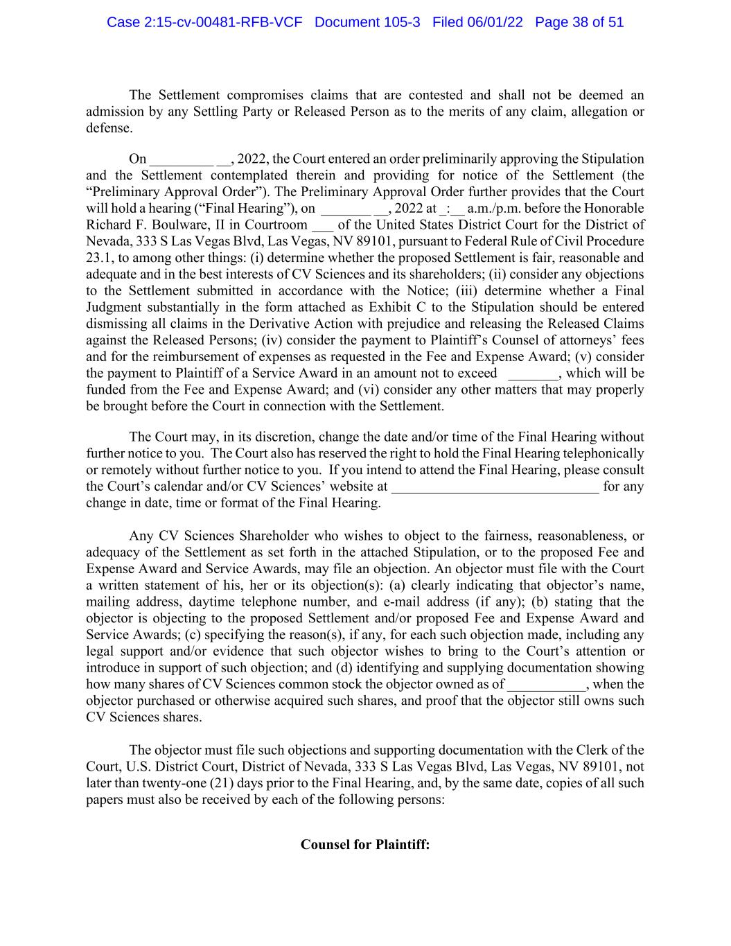 The Settlement compromises claims that are contested and shall not be deemed an admission by any Settling Party or Released Person as to the merits of any claim, allegation or defense. On _________ __, 2022, the Court entered an order preliminarily approving the Stipulation and the Settlement contemplated therein and providing for notice of the Settlement (the “Preliminary Approval Order”). The Preliminary Approval Order further provides that the Court will hold a hearing (“Final Hearing”), on _______ __, 2022 at _:__ a.m./p.m. before the Honorable Richard F. Boulware, II in Courtroom ___ of the United States District Court for the District of Nevada, 333 S Las Vegas Blvd, Las Vegas, NV 89101, pursuant to Federal Rule of Civil Procedure 23.1, to among other things: (i) determine whether the proposed Settlement is fair, reasonable and adequate and in the best interests of CV Sciences and its shareholders; (ii) consider any objections to the Settlement submitted in accordance with the Notice; (iii) determine whether a Final Judgment substantially in the form attached as Exhibit C to the Stipulation should be entered dismissing all claims in the Derivative Action with prejudice and releasing the Released Claims against the Released Persons; (iv) consider the payment to Plaintiff’s Counsel of attorneys’ fees and for the reimbursement of expenses as requested in the Fee and Expense Award; (v) consider the payment to Plaintiff of a Service Award in an amount not to exceed $_______, which will be funded from the Fee and Expense Award; and (vi) consider any other matters that may properly be brought before the Court in connection with the Settlement. The Court may, in its discretion, change the date and/or time of the Final Hearing without further notice to you. The Court also has reserved the right to hold the Final Hearing telephonically or remotely without further notice to you. If you intend to attend the Final Hearing, please consult the Court’s calendar and/or CV Sciences’ website at _____________________________ for any change in date, time or format of the Final Hearing. Any CV Sciences Shareholder who wishes to object to the fairness, reasonableness, or adequacy of the Settlement as set forth in the attached Stipulation, or to the proposed Fee and Expense Award and Service Awards, may file an objection. An objector must file with the Court a written statement of his, her or its objection(s): (a) clearly indicating that objector’s name, mailing address, daytime telephone number, and e-mail address (if any); (b) stating that the objector is objecting to the proposed Settlement and/or proposed Fee and Expense Award and Service Awards; (c) specifying the reason(s), if any, for each such objection made, including any legal support and/or evidence that such objector wishes to bring to the Court’s attention or introduce in support of such objection; and (d) identifying and supplying documentation showing how many shares of CV Sciences common stock the objector owned as of ___________, when the objector purchased or otherwise acquired such shares, and proof that the objector still owns such CV Sciences shares. The objector must file such objections and supporting documentation with the Clerk of the Court, U.S. District Court, District of Nevada, 333 S Las Vegas Blvd, Las Vegas, NV 89101, not later than twenty-one (21) days prior to the Final Hearing, and, by the same date, copies of all such papers must also be received by each of the following persons: Counsel for Plaintiff: Case 2:15-cv-00481-RFB-VCF Document 105-3 Filed 06/01/22 Page 38 of 51