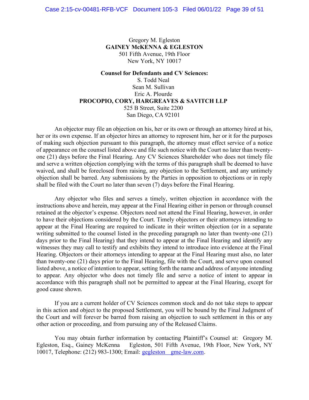 Gregory M. Egleston GAINEY McKENNA & EGLESTON 501 Fifth Avenue, 19th Floor New York, NY 10017 Counsel for Defendants and CV Sciences: S. Todd Neal Sean M. Sullivan Eric A. Plourde PROCOPIO, CORY, HARGREAVES & SAVITCH LLP 525 B Street, Suite 2200 San Diego, CA 92101 An objector may file an objection on his, her or its own or through an attorney hired at his, her or its own expense. If an objector hires an attorney to represent him, her or it for the purposes of making such objection pursuant to this paragraph, the attorney must effect service of a notice of appearance on the counsel listed above and file such notice with the Court no later than twenty- one (21) days before the Final Hearing. Any CV Sciences Shareholder who does not timely file and serve a written objection complying with the terms of this paragraph shall be deemed to have waived, and shall be foreclosed from raising, any objection to the Settlement, and any untimely objection shall be barred. Any submissions by the Parties in opposition to objections or in reply shall be filed with the Court no later than seven (7) days before the Final Hearing. Any objector who files and serves a timely, written objection in accordance with the instructions above and herein, may appear at the Final Hearing either in person or through counsel retained at the objector’s expense. Objectors need not attend the Final Hearing, however, in order to have their objections considered by the Court. Timely objectors or their attorneys intending to appear at the Final Hearing are required to indicate in their written objection (or in a separate writing submitted to the counsel listed in the preceding paragraph no later than twenty-one (21) days prior to the Final Hearing) that they intend to appear at the Final Hearing and identify any witnesses they may call to testify and exhibits they intend to introduce into evidence at the Final Hearing. Objectors or their attorneys intending to appear at the Final Hearing must also, no later than twenty-one (21) days prior to the Final Hearing, file with the Court, and serve upon counsel listed above, a notice of intention to appear, setting forth the name and address of anyone intending to appear. Any objector who does not timely file and serve a notice of intent to appear in accordance with this paragraph shall not be permitted to appear at the Final Hearing, except for good cause shown. If you are a current holder of CV Sciences common stock and do not take steps to appear in this action and object to the proposed Settlement, you will be bound by the Final Judgment of the Court and will forever be barred from raising an objection to such settlement in this or any other action or proceeding, and from pursuing any of the Released Claims. You may obtain further information by contacting Plaintiff’s Counsel at: Gregory M. Egleston, Esq., Gainey McKenna & Egleston, 501 Fifth Avenue, 19th Floor, New York, NY 10017, Telephone: (212) 983-1300; Email: gegleston@gme-law.com. Case 2:15-cv-00481-RFB-VCF Document 105-3 Filed 06/01/22 Page 39 of 51