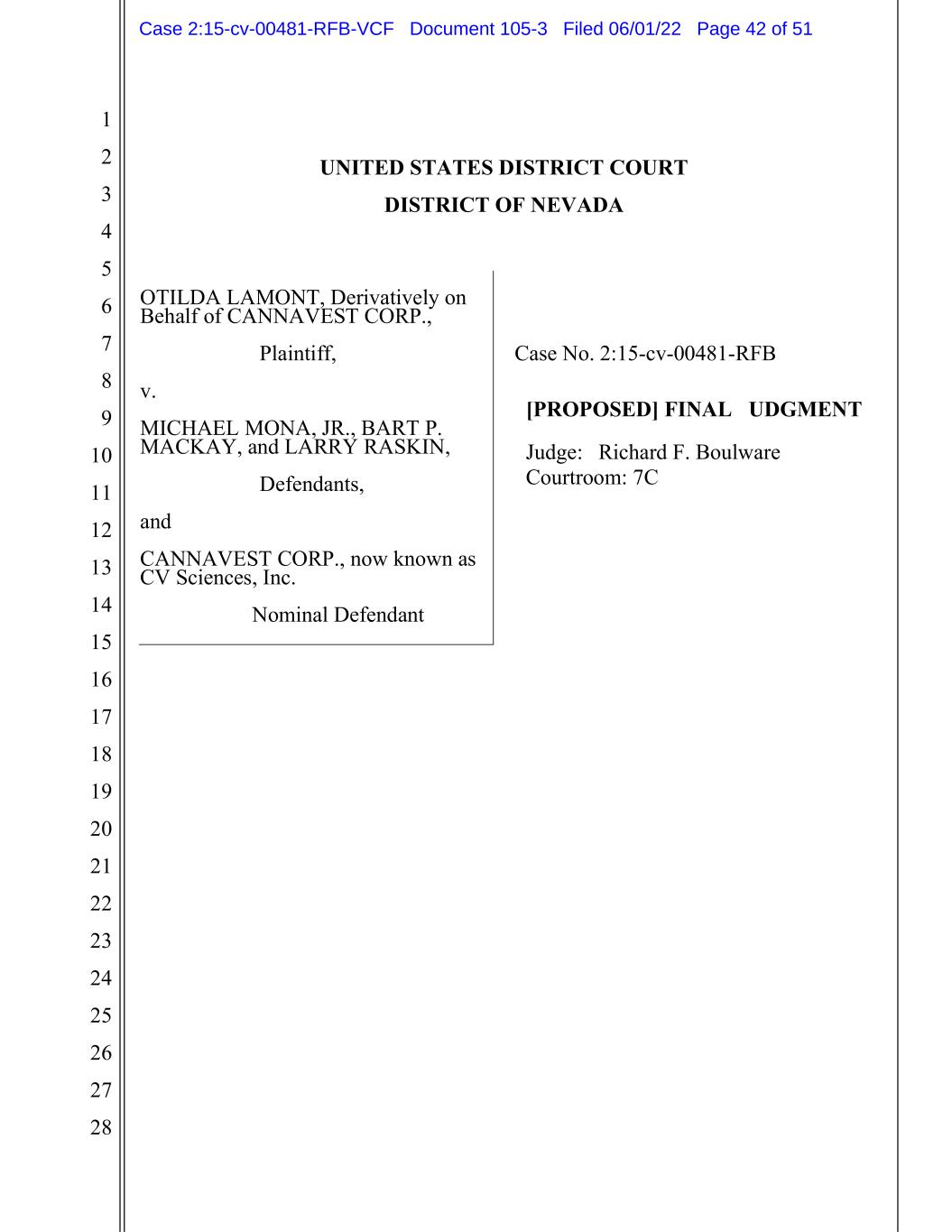 1 2 3 4 5 6 7 8 9 10 11 12 13 14 15 16 17 18 19 20 21 22 23 24 25 26 27 28 UNITED STATES DISTRICT COURT DISTRICT OF NEVADA OTILDA LAMONT, Derivatively on Behalf of CANNAVEST CORP., Plaintiff, v. MICHAEL MONA, JR., BART P. MACKAY, and LARRY RASKIN, Defendants, and CANNAVEST CORP., now known as CV Sciences, Inc. Nominal Defendant Case No. 2:15-cv-00481-RFB [PROPOSED] FINAL JUDGMENT Judge: Richard F. Boulware Courtroom: 7C Case 2:15-cv-00481-RFB-VCF Document 105-3 Filed 06/01/22 Page 42 of 51