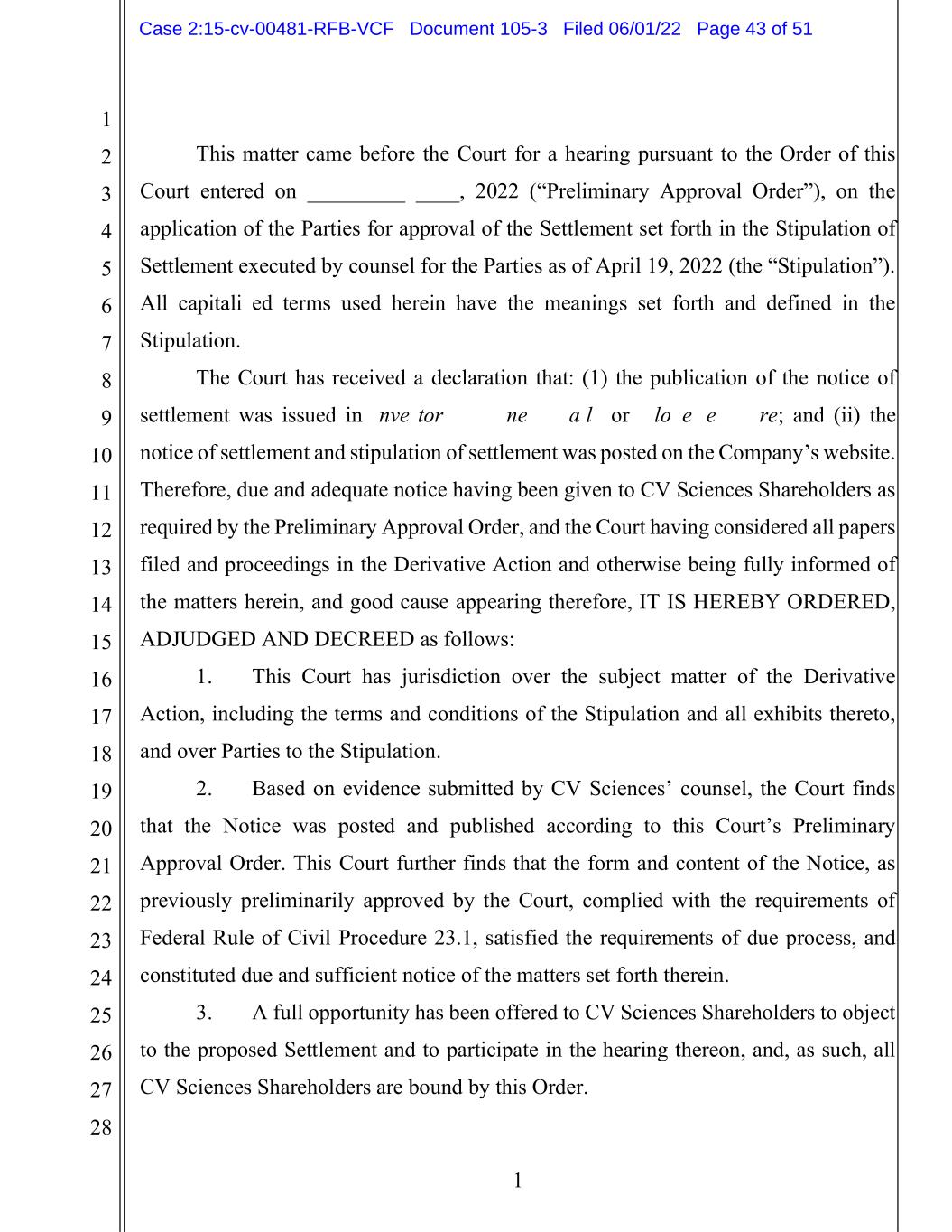 1 2 3 4 5 6 7 8 9 10 11 12 13 14 15 16 17 18 19 20 21 22 23 24 25 26 27 28 1 This matter came before the Court for a hearing pursuant to the Order of this Court entered on _________ ____, 2022 (“Preliminary Approval Order”), on the application of the Parties for approval of the Settlement set forth in the Stipulation of Settlement executed by counsel for the Parties as of April 19, 2022 (the “Stipulation”). All capitalized terms used herein have the meanings set forth and defined in the Stipulation. The Court has received a declaration that: (1) the publication of the notice of settlement was issued in Investor’s Business Daily or GlobeNewswire; and (ii) the notice of settlement and stipulation of settlement was posted on the Company’s website. Therefore, due and adequate notice having been given to CV Sciences Shareholders as required by the Preliminary Approval Order, and the Court having considered all papers filed and proceedings in the Derivative Action and otherwise being fully informed of the matters herein, and good cause appearing therefore, IT IS HEREBY ORDERED, ADJUDGED AND DECREED as follows: 1. This Court has jurisdiction over the subject matter of the Derivative Action, including the terms and conditions of the Stipulation and all exhibits thereto, and over Parties to the Stipulation. 2. Based on evidence submitted by CV Sciences’ counsel, the Court finds that the Notice was posted and published according to this Court’s Preliminary Approval Order. This Court further finds that the form and content of the Notice, as previously preliminarily approved by the Court, complied with the requirements of Federal Rule of Civil Procedure 23.1, satisfied the requirements of due process, and constituted due and sufficient notice of the matters set forth therein. 3. A full opportunity has been offered to CV Sciences Shareholders to object to the proposed Settlement and to participate in the hearing thereon, and, as such, all CV Sciences Shareholders are bound by this Order. Case 2:15-cv-00481-RFB-VCF Document 105-3 Filed 06/01/22 Page 43 of 51