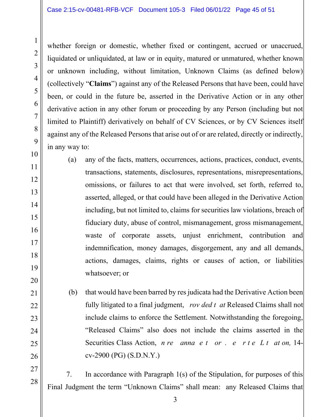 1 2 3 4 5 6 7 8 9 10 11 12 13 14 15 16 17 18 19 20 21 22 23 24 25 26 27 28 3 whether foreign or domestic, whether fixed or contingent, accrued or unaccrued, liquidated or unliquidated, at law or in equity, matured or unmatured, whether known or unknown including, without limitation, Unknown Claims (as defined below) (collectively “Claims”) against any of the Released Persons that have been, could have been, or could in the future be, asserted in the Derivative Action or in any other derivative action in any other forum or proceeding by any Person (including but not limited to Plaintiff) derivatively on behalf of CV Sciences, or by CV Sciences itself against any of the Released Persons that arise out of or are related, directly or indirectly, in any way to: (a) any of the facts, matters, occurrences, actions, practices, conduct, events, transactions, statements, disclosures, representations, misrepresentations, omissions, or failures to act that were involved, set forth, referred to, asserted, alleged, or that could have been alleged in the Derivative Action including, but not limited to, claims for securities law violations, breach of fiduciary duty, abuse of control, mismanagement, gross mismanagement, waste of corporate assets, unjust enrichment, contribution and indemnification, money damages, disgorgement, any and all demands, actions, damages, claims, rights or causes of action, or liabilities whatsoever; or (b) that would have been barred by res judicata had the Derivative Action been fully litigated to a final judgment, provided that Released Claims shall not include claims to enforce the Settlement. Notwithstanding the foregoing, “Released Claims” also does not include the claims asserted in the Securities Class Action, In re CannaVest Corp. Securities Litigation, 14- cv-2900 (PG) (S.D.N.Y.) 7. In accordance with Paragraph 1(s) of the Stipulation, for purposes of this Final Judgment the term “Unknown Claims” shall mean: any Released Claims that Case 2:15-cv-00481-RFB-VCF Document 105-3 Filed 06/01/22 Page 45 of 51