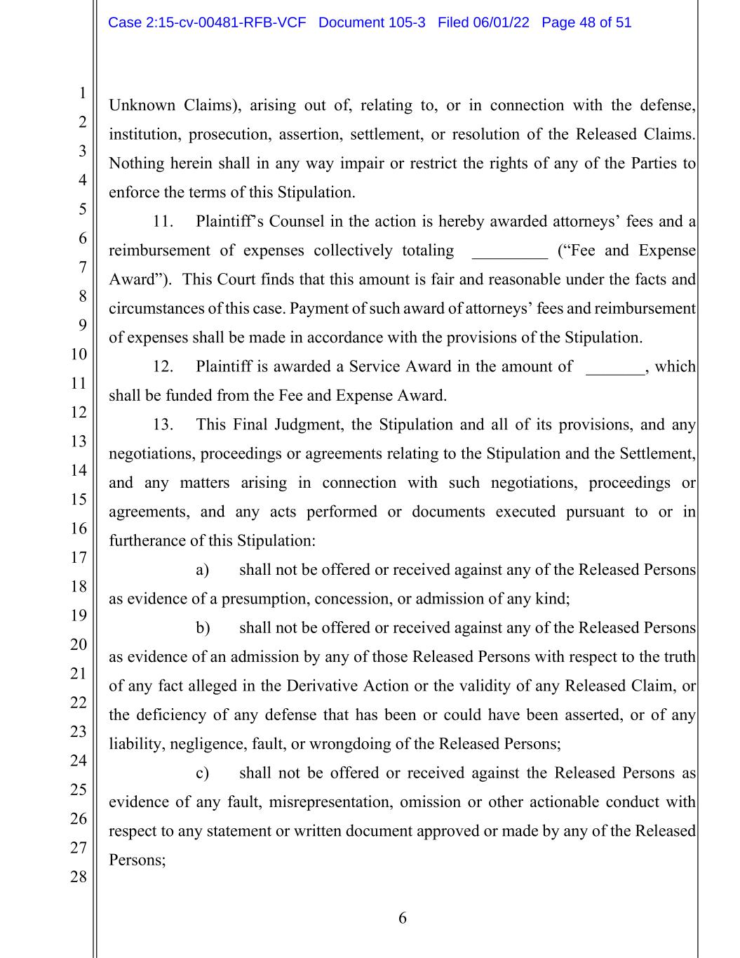 1 2 3 4 5 6 7 8 9 10 11 12 13 14 15 16 17 18 19 20 21 22 23 24 25 26 27 28 6 Unknown Claims), arising out of, relating to, or in connection with the defense, institution, prosecution, assertion, settlement, or resolution of the Released Claims. Nothing herein shall in any way impair or restrict the rights of any of the Parties to enforce the terms of this Stipulation. 11. Plaintiff’s Counsel in the action is hereby awarded attorneys’ fees and a reimbursement of expenses collectively totaling $_________ (“Fee and Expense Award”). This Court finds that this amount is fair and reasonable under the facts and circumstances of this case. Payment of such award of attorneys’ fees and reimbursement of expenses shall be made in accordance with the provisions of the Stipulation. 12. Plaintiff is awarded a Service Award in the amount of $_______, which shall be funded from the Fee and Expense Award. 13. This Final Judgment, the Stipulation and all of its provisions, and any negotiations, proceedings or agreements relating to the Stipulation and the Settlement, and any matters arising in connection with such negotiations, proceedings or agreements, and any acts performed or documents executed pursuant to or in furtherance of this Stipulation: a) shall not be offered or received against any of the Released Persons as evidence of a presumption, concession, or admission of any kind; b) shall not be offered or received against any of the Released Persons as evidence of an admission by any of those Released Persons with respect to the truth of any fact alleged in the Derivative Action or the validity of any Released Claim, or the deficiency of any defense that has been or could have been asserted, or of any liability, negligence, fault, or wrongdoing of the Released Persons; c) shall not be offered or received against the Released Persons as evidence of any fault, misrepresentation, omission or other actionable conduct with respect to any statement or written document approved or made by any of the Released Persons; Case 2:15-cv-00481-RFB-VCF Document 105-3 Filed 06/01/22 Page 48 of 51