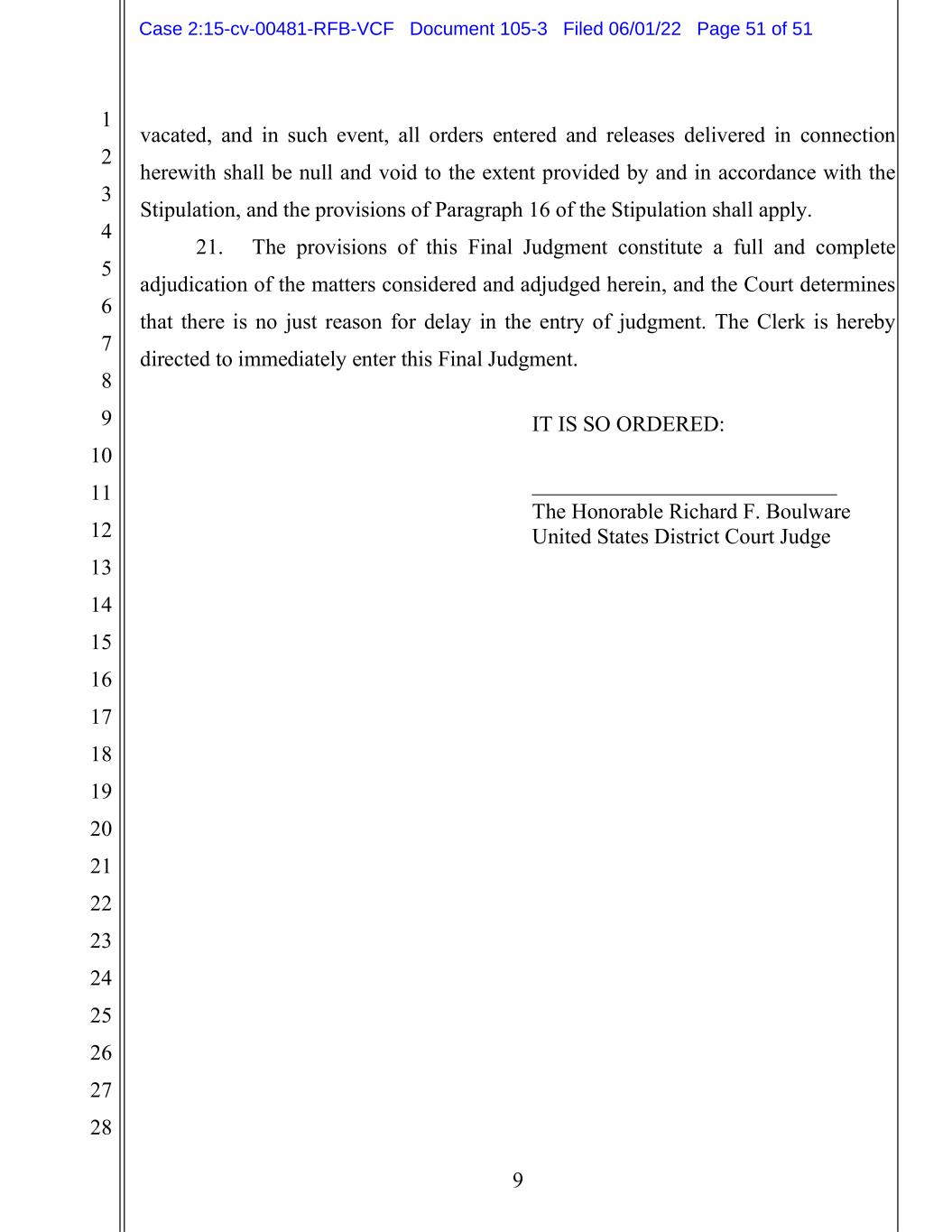 1 2 3 4 5 6 7 8 9 10 11 12 13 14 15 16 17 18 19 20 21 22 23 24 25 26 27 28 9 vacated, and in such event, all orders entered and releases delivered in connection herewith shall be null and void to the extent provided by and in accordance with the Stipulation, and the provisions of Paragraph 16 of the Stipulation shall apply. 21. The provisions of this Final Judgment constitute a full and complete adjudication of the matters considered and adjudged herein, and the Court determines that there is no just reason for delay in the entry of judgment. The Clerk is hereby directed to immediately enter this Final Judgment. IT IS SO ORDERED: ____________________________ The Honorable Richard F. Boulware United States District Court Judge Case 2:15-cv-00481-RFB-VCF Document 105-3 Filed 06/01/22 Page 51 of 51
